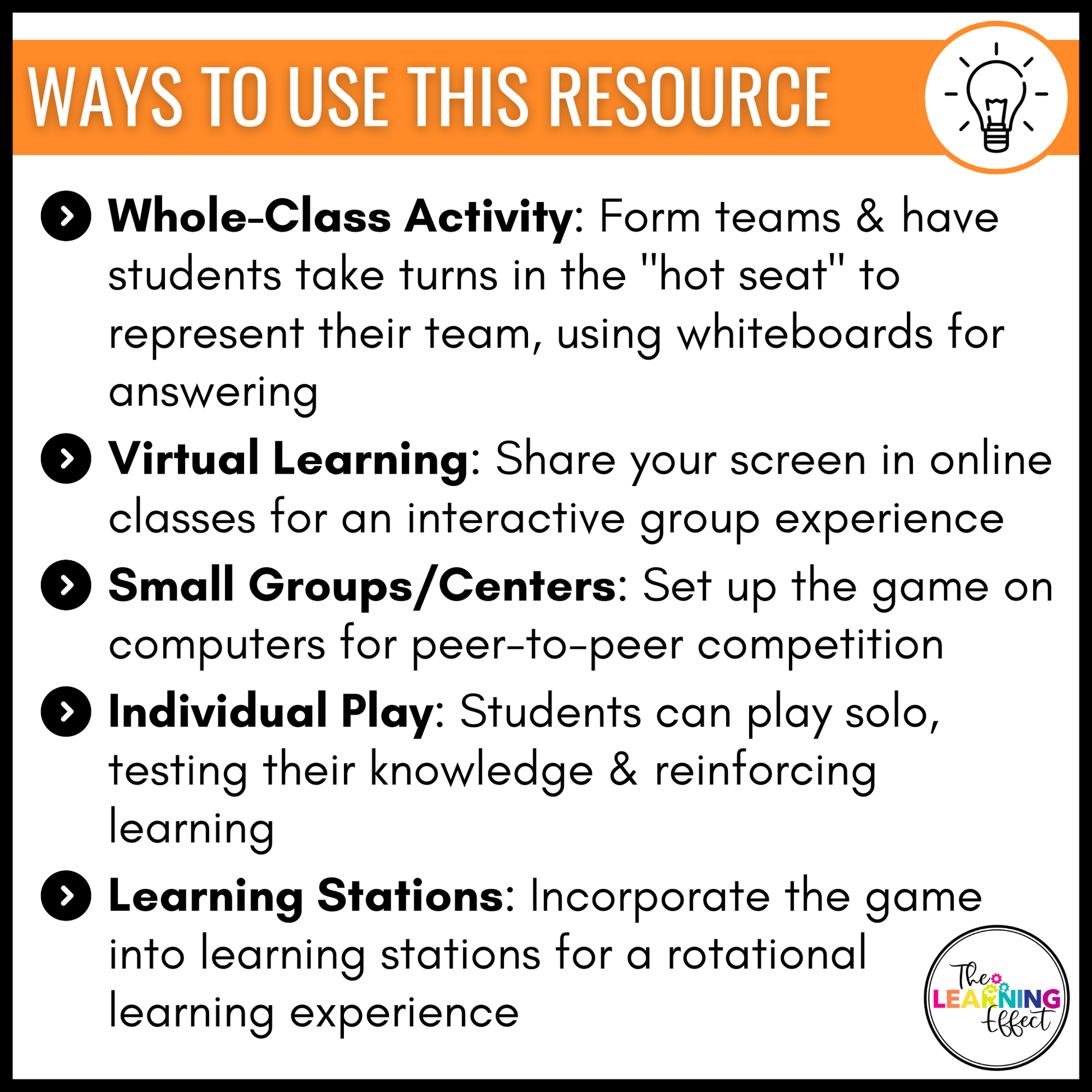 - WHOLE-CLASS: Split students into teams. During each round, a student from each team goes into the "hot seat" to compete for their team. All students need whiteboards to solve during the game.