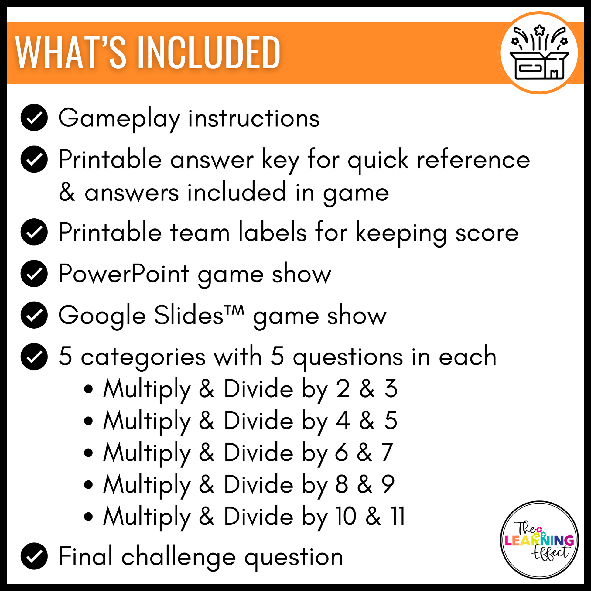 - Google Slides game show (*Please note: Google Slides doesn’t have the same capabilities as PowerPoint, so the game board values won’t disappear. You will have to track which questions you’ve already picked. A tracking sheet is included.*)