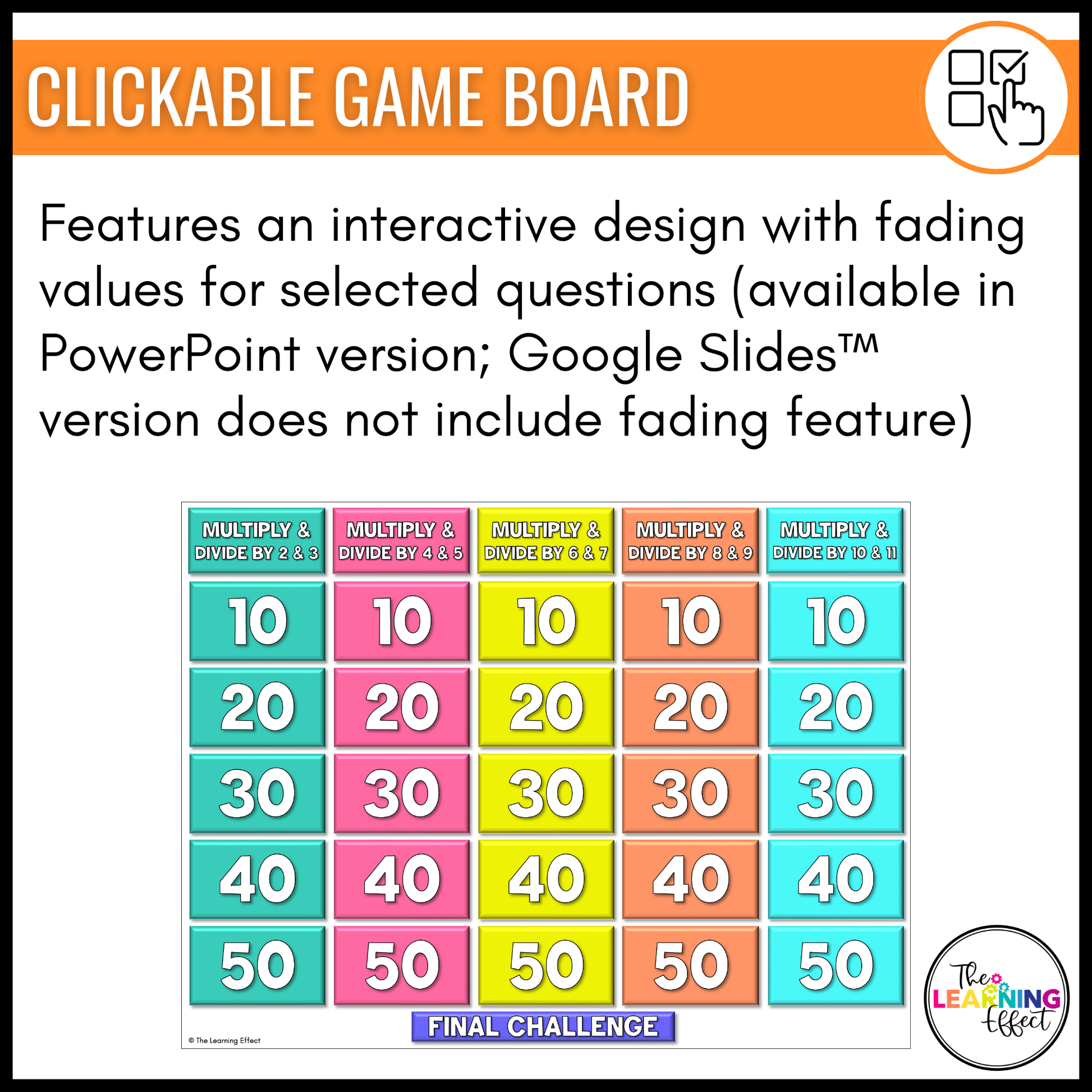- Clickable, Jeopardy-style game board that fades values that have been chosen (only the PowerPoint version fades values)
