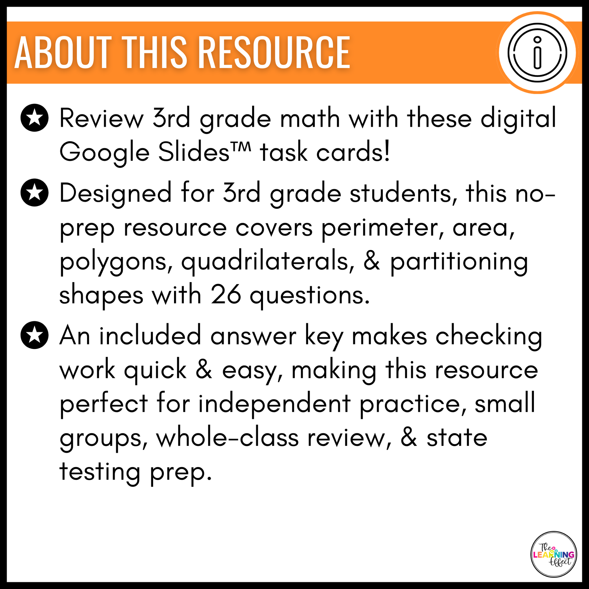 Make practicing 3rd grade math skills engaging, self-paced, and stress-free with these Google Slides task cards. This activity covers 3rd grade math skills like perimeter, area, polygons, quadrilaterals, and partitioning shapes, making it perfect for independent practice, small group work, whole-class review, or test prep.