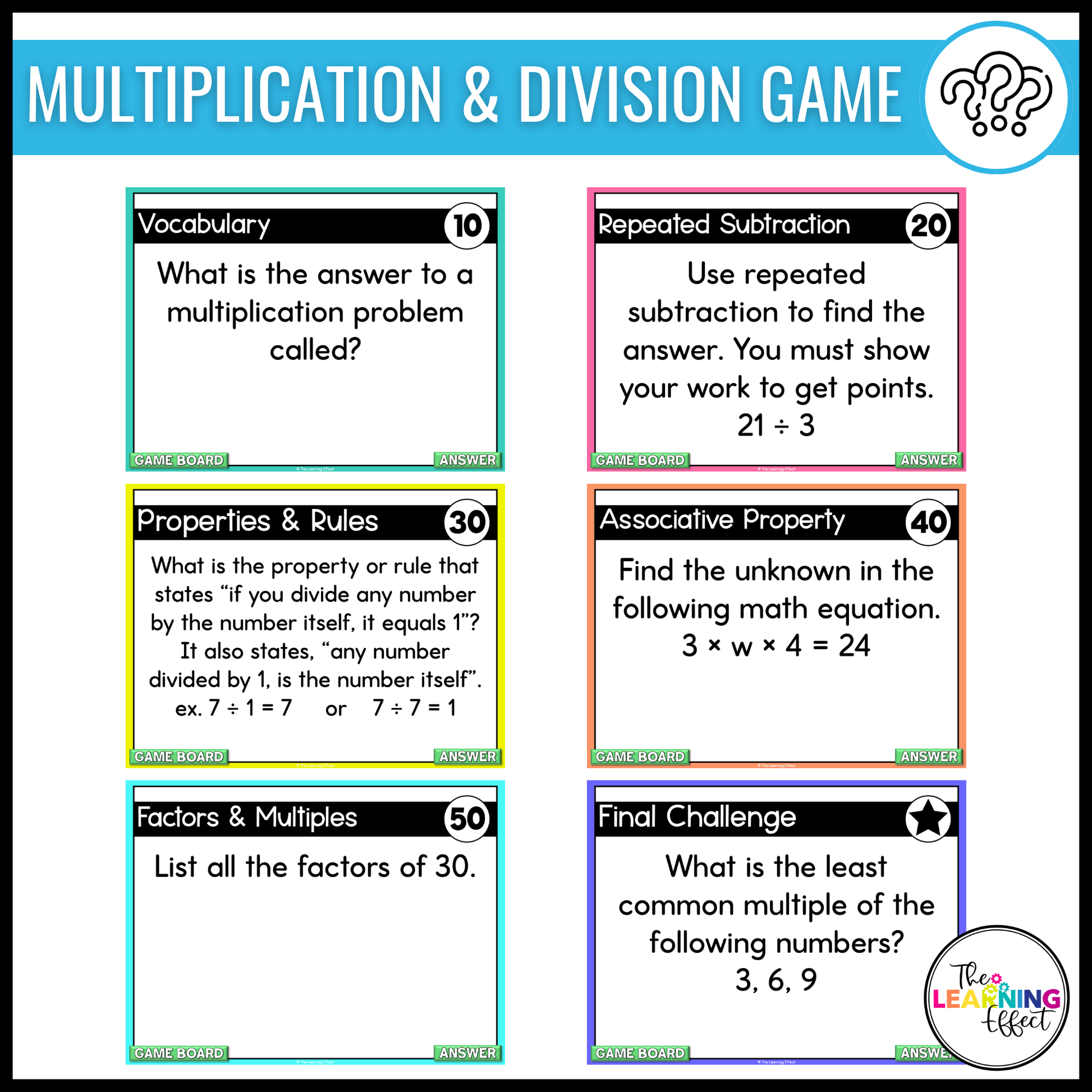 Review 4th grade multiplication and division of whole numbers standards in a fun and interactive way that involves your whole class. These engaging game shows play like Jeopardy® and cover 4th grade math skills. Perfect for an end of year or end of unit review.