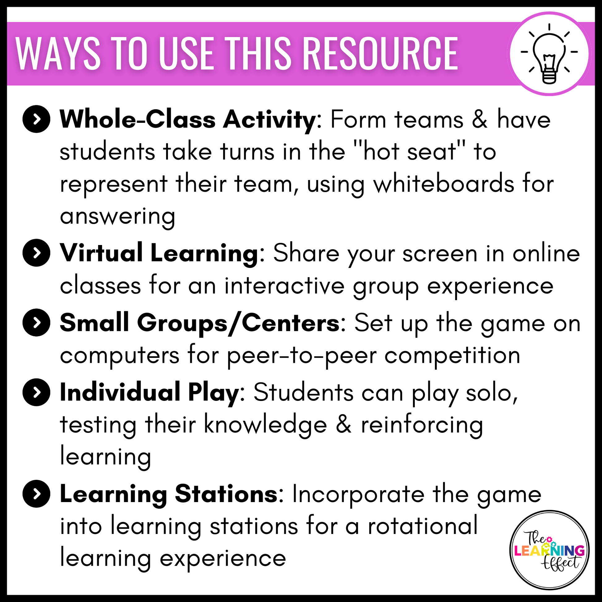 - Google Slides game show (*Please note: Google Slides doesn’t have the same capabilities as PowerPoint, so the game board values won’t disappear. You will have to track which questions you’ve already picked. A tracking sheet is included.*)