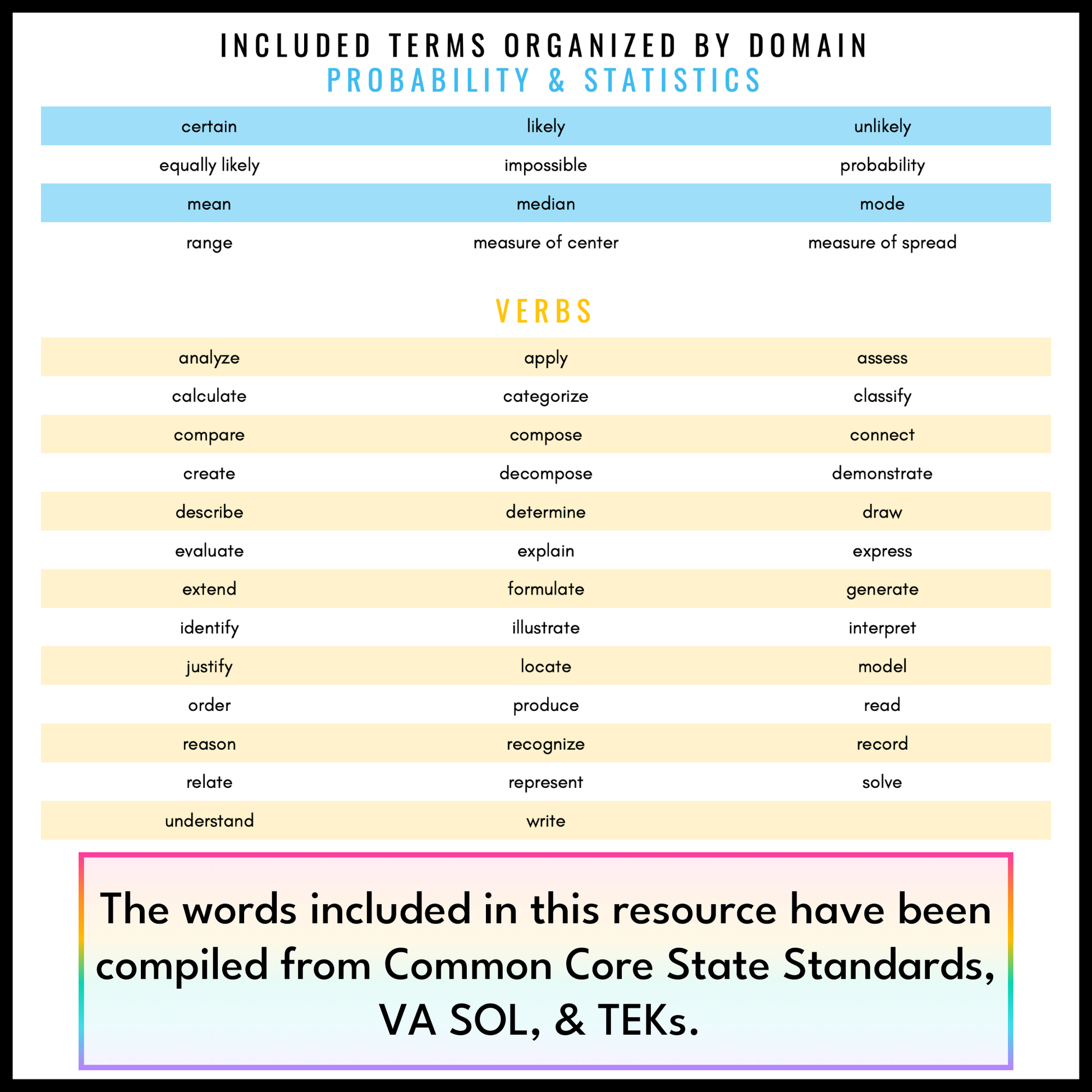 Each word card features the term written clearly at the top, with a kid-friendly definition and related image. The words included in this resource have been compiled from Common Core State Standards, VA SOL, and TEKs.