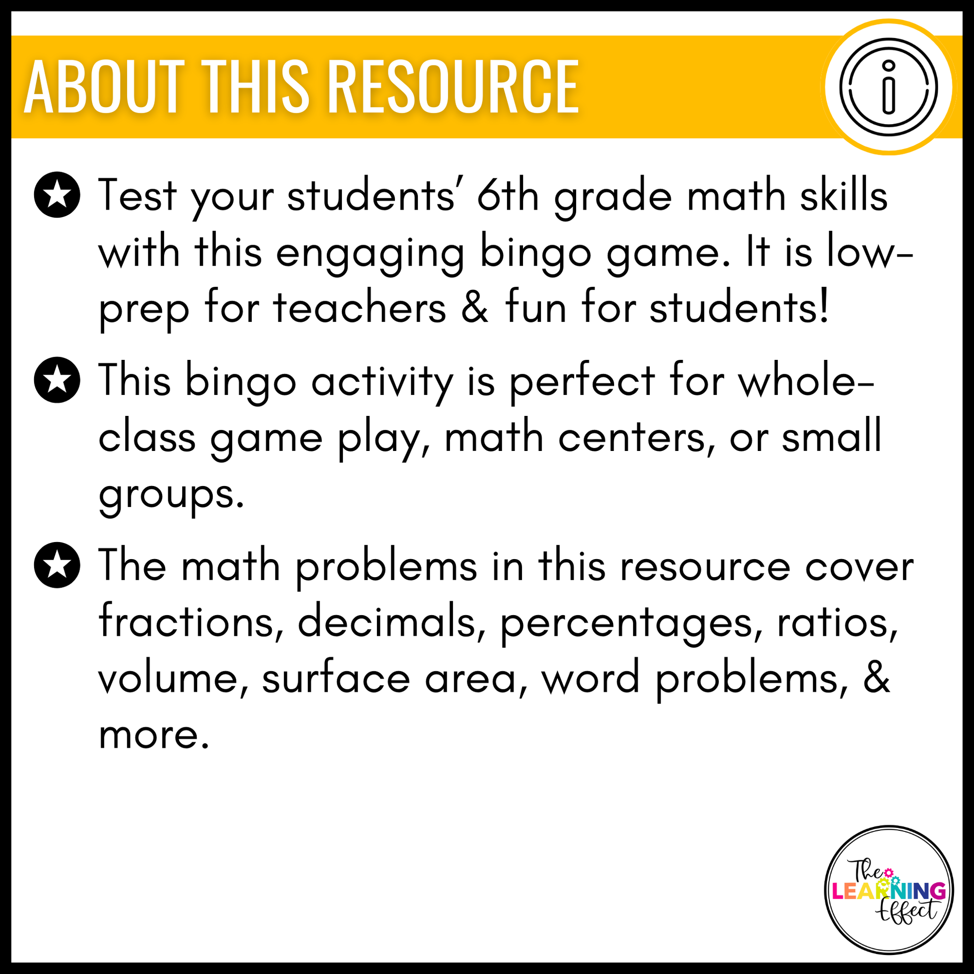 Try a new way to review 6th grade math concepts with this bingo game! This engaging test prep is low prep for teachers and fun for students.
