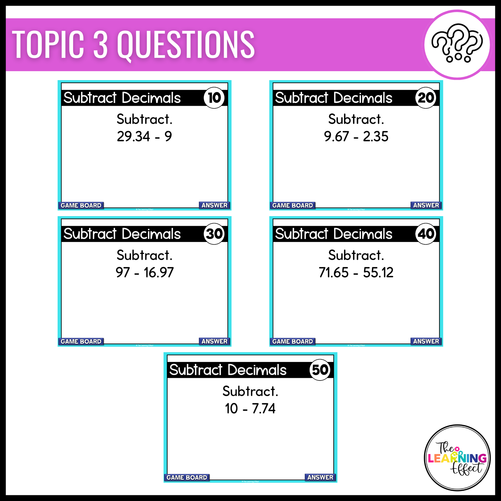 Review Adding and Subtracting Decimals in a fun and interactive way that involves your whole class. This engaging game show plays like Jeopardy® and covers 5th grade math skills, including adding decimals, subtracting decimals, and word problems. Perfect for an end of year or end of unit review.
