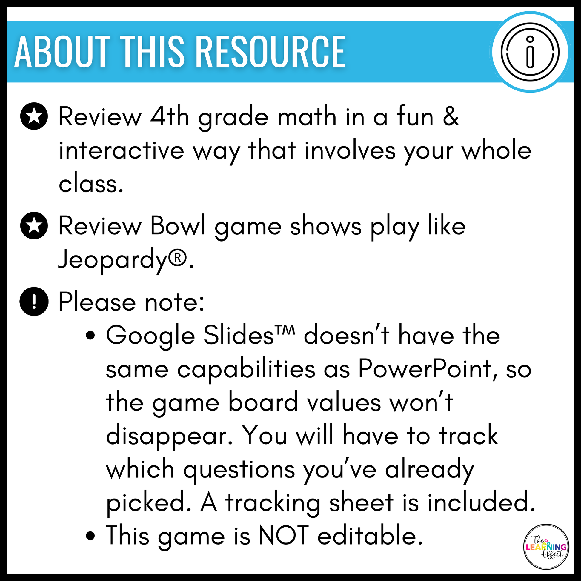 - Google Slides game show (*Please note: Google Slides doesn’t have the same capabilities as PowerPoint, so the game board values won’t disappear. You will have to track which questions you’ve already picked. A tracking sheet is included.*)