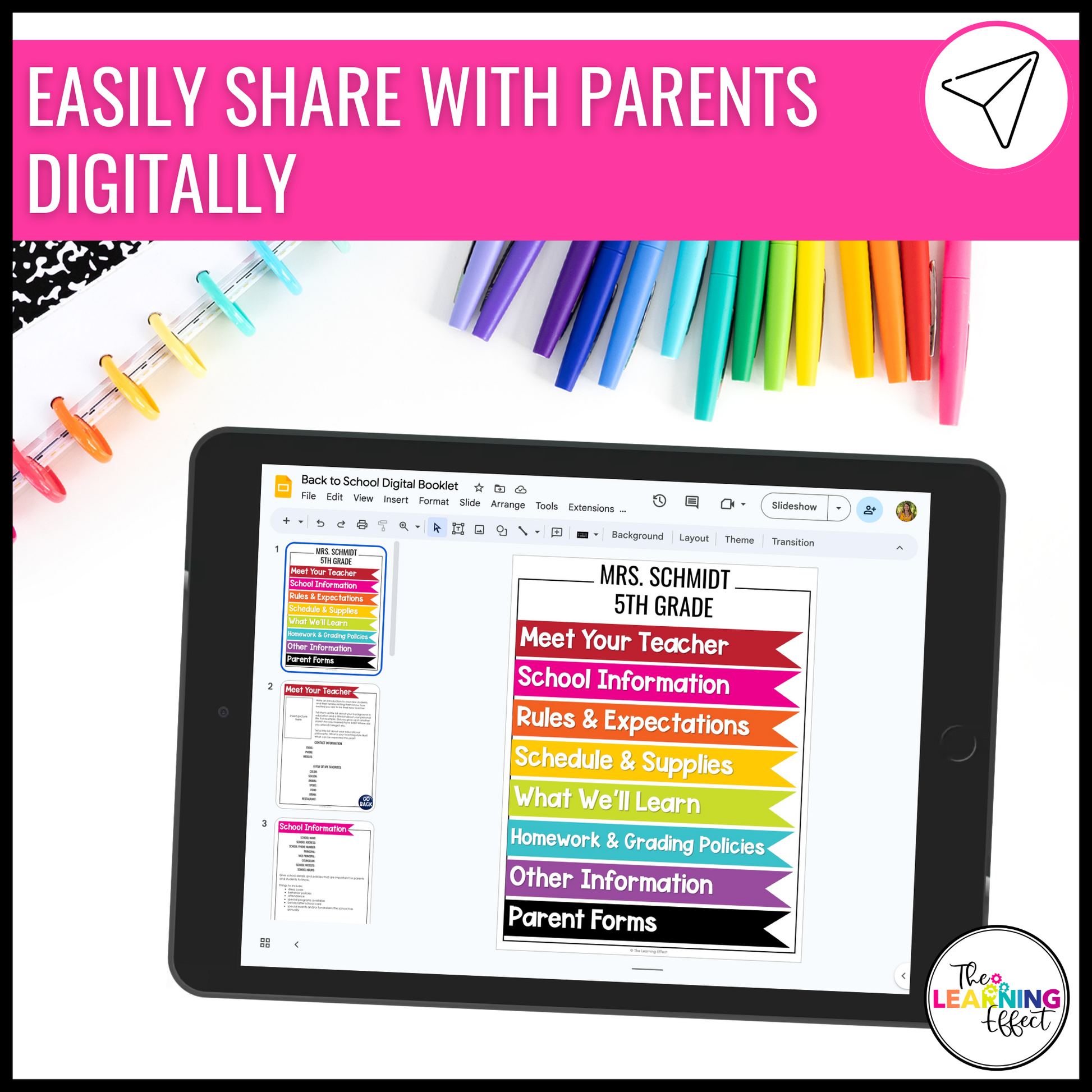 This back to school clickable digital booklet is an easy way to communicate information with parents. The best part is it's easy to embed into your website or share with parents via email. When you make changes to any of the info, it will automatically update for viewers!