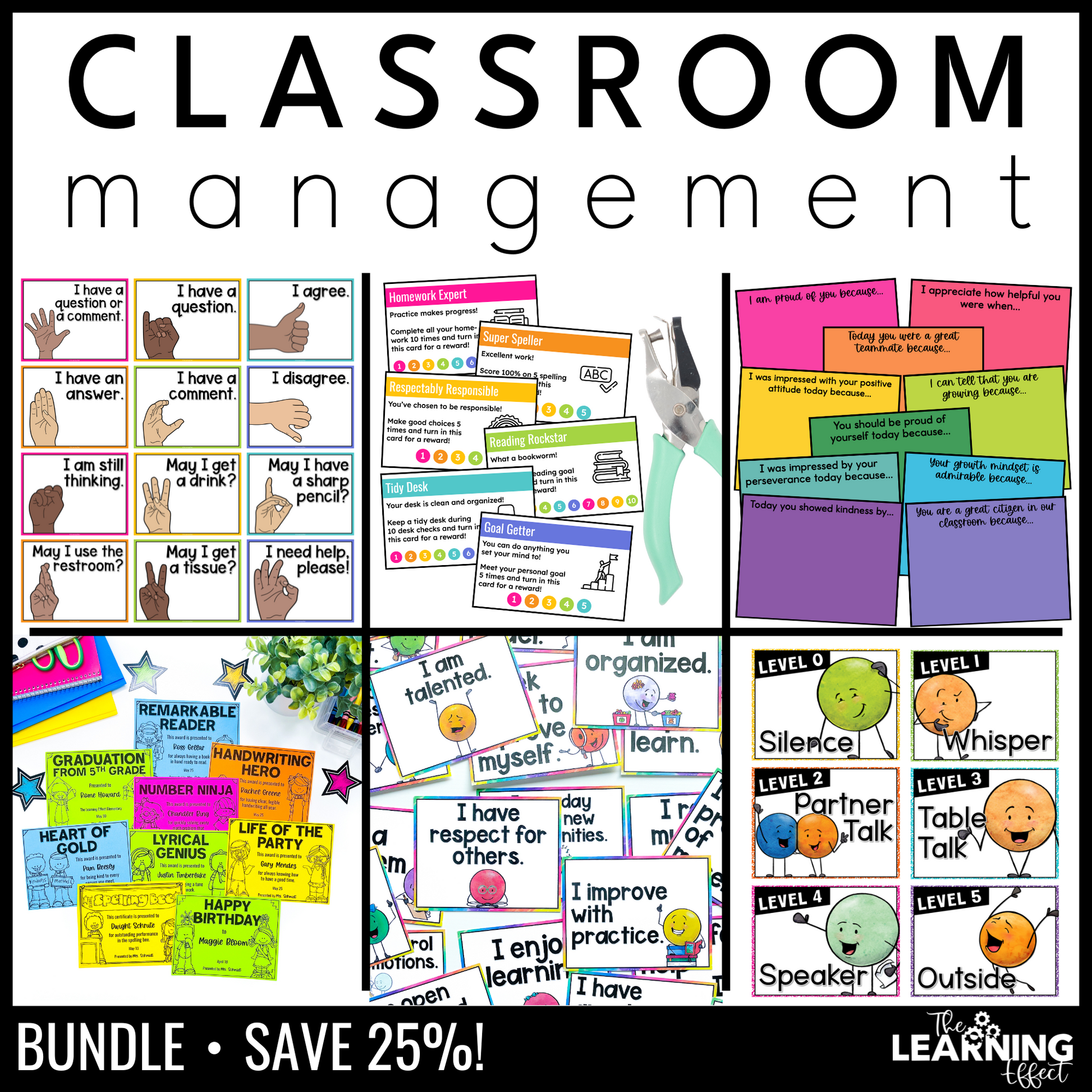 Perfect for back to school and all year long. Includes Hand Signal Posters, Voice Level Chart, Positive Notes for Students, Student Award Templates, Positive Affirmations for Kids Posters, and Punch Cards.