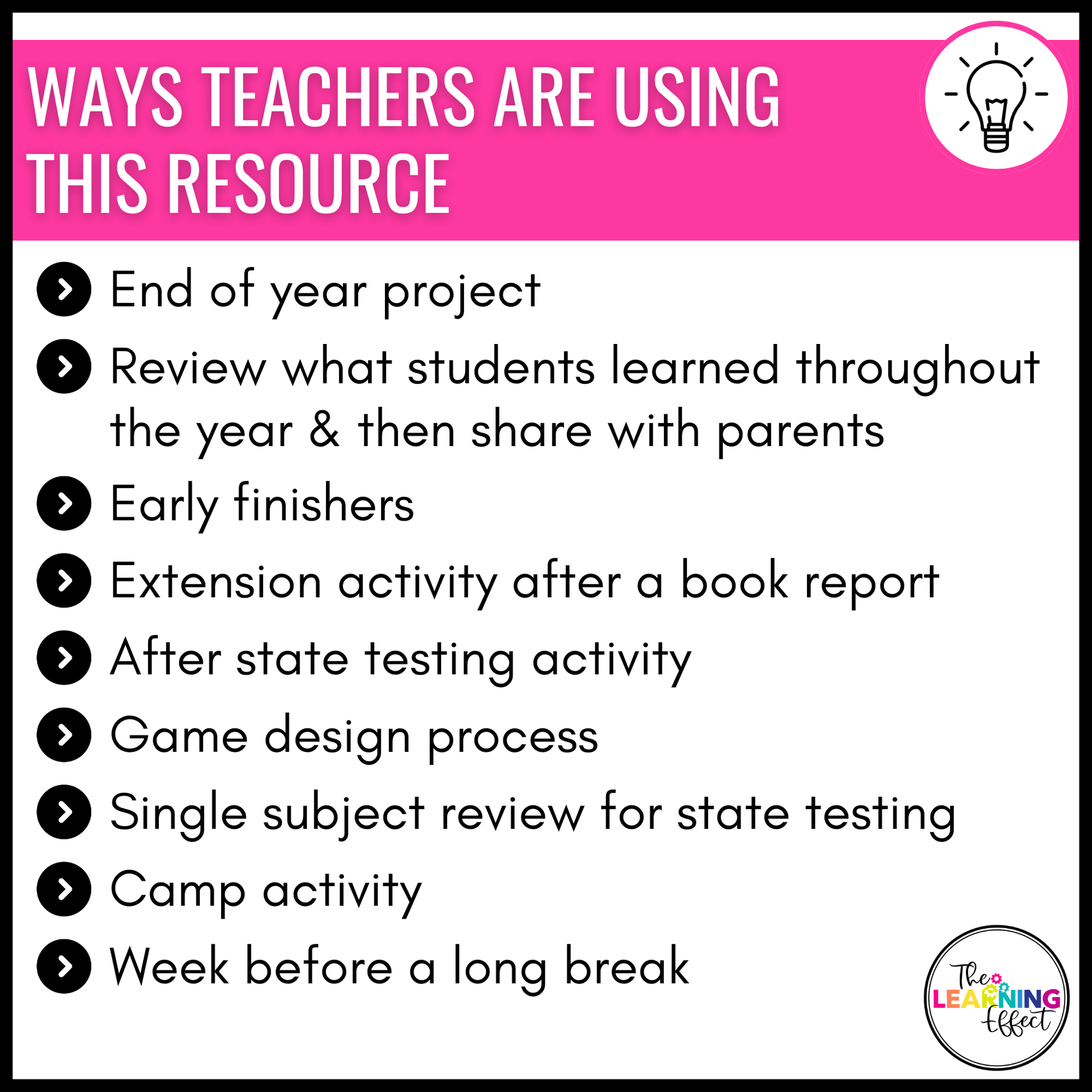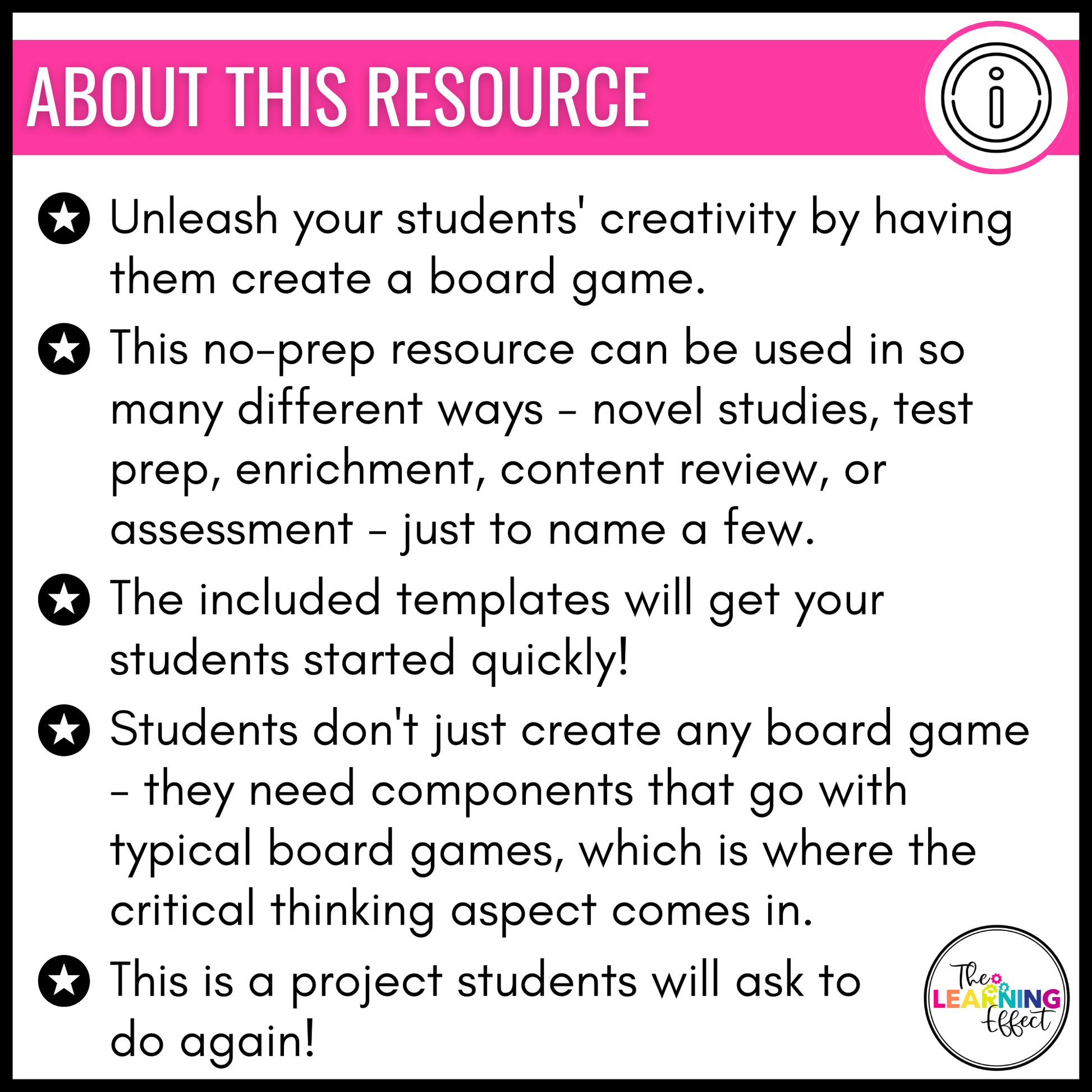 Unleash your students' creativity by having them create their own board game. This no-prep resource can be used in so many different ways - novel studies, test prep, enrichment, content review, or assessment - just to name a few.