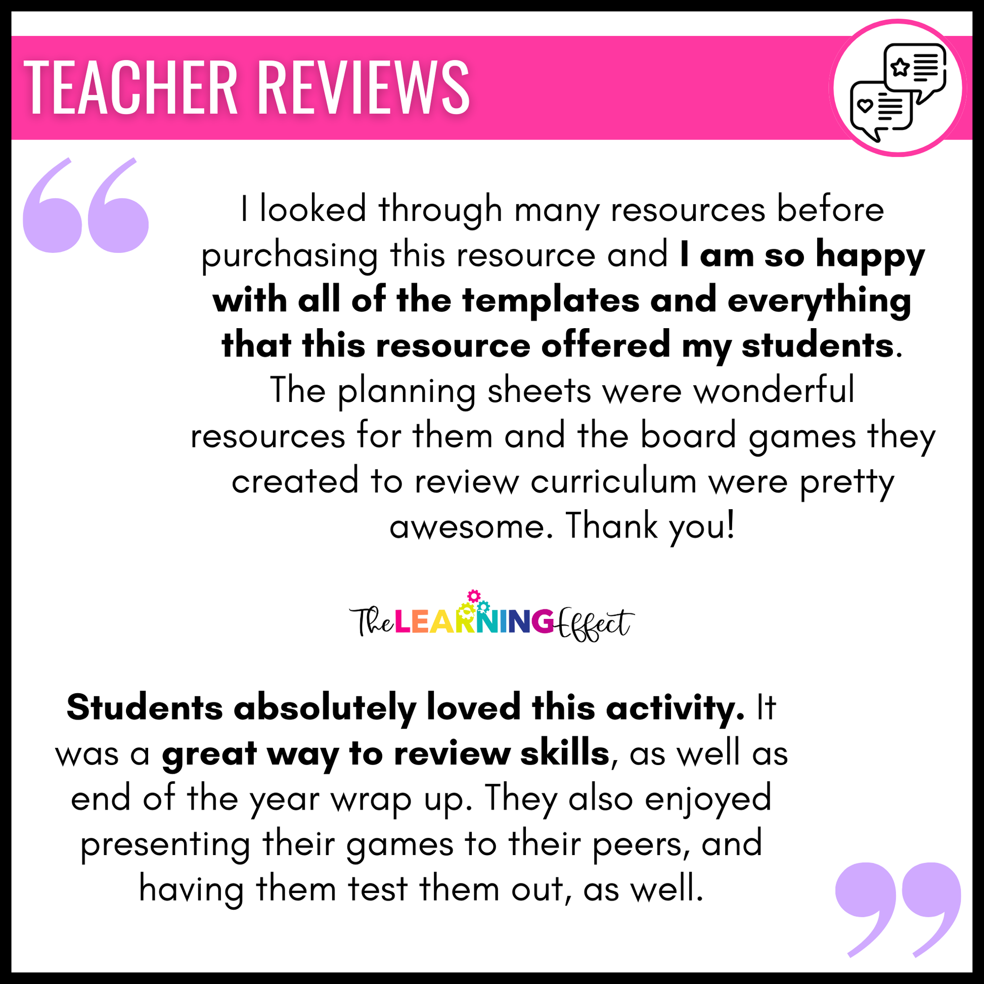 Students don't just create any board game - they need components that go with typical board games, which is where the critical thinking aspect comes in. They will write instructions, create game pieces, write content questions, and try out each other's games to make sure they work. This is a project students will ask to do again!
