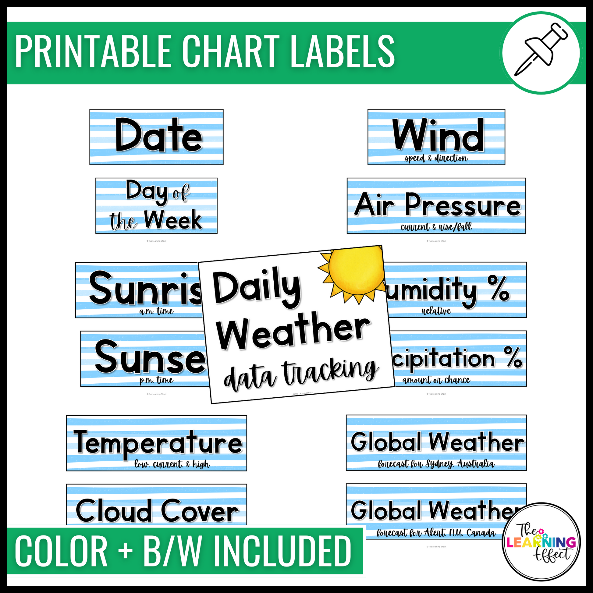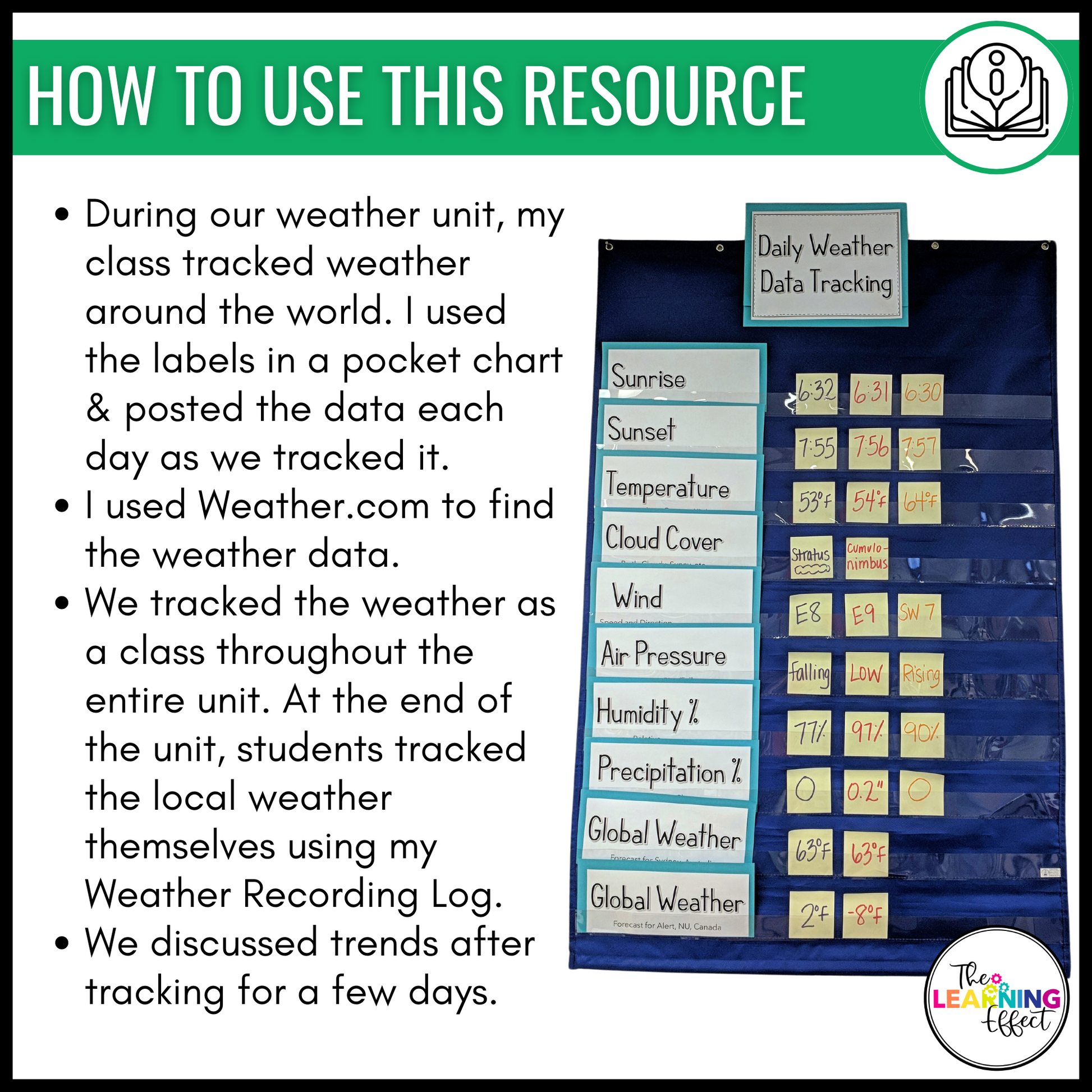 Tracking daily weather patterns is a great way to show students how the different components of weather affect what will happen tomorrow. This resource is perfect for tracking weather with your whole class throughout your weather unit. Labels for components to track and a student tracking worksheet are included.