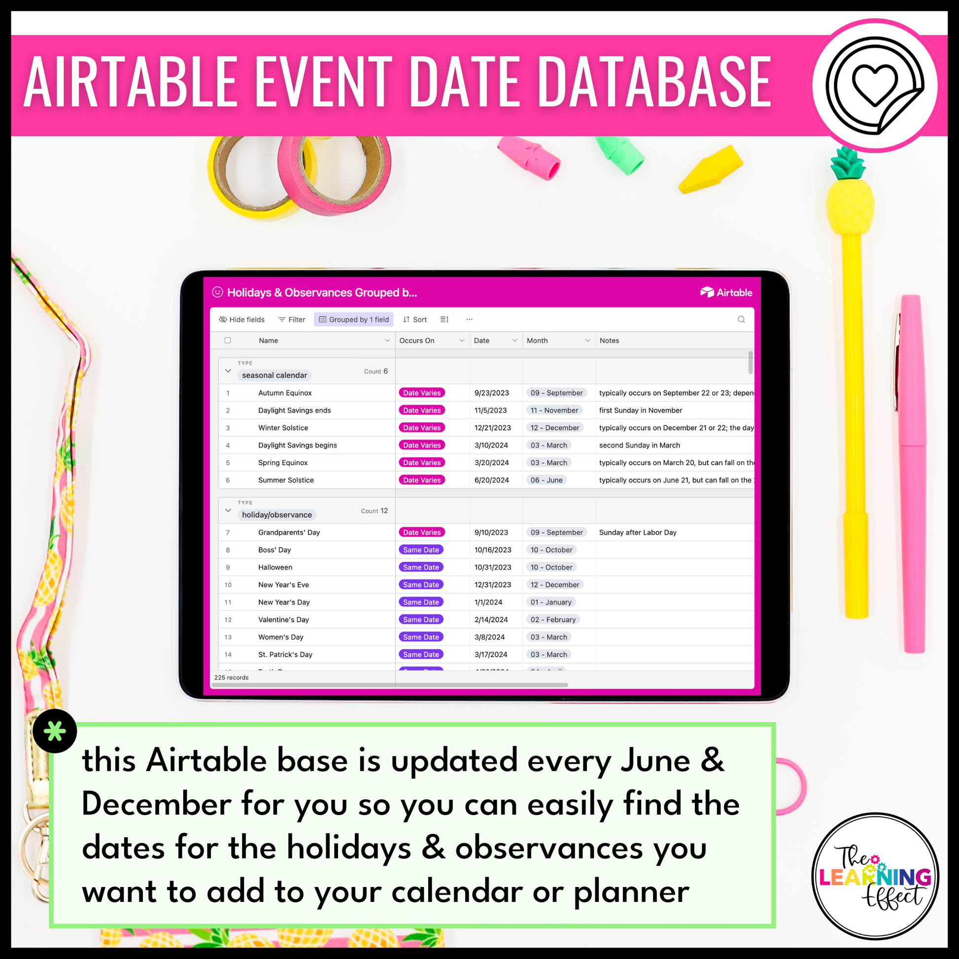 - Airtable base with dates for the holidays and observance stickers that are included. I will update the database each year to help you easily find when holidays and observances fall in the calendar.