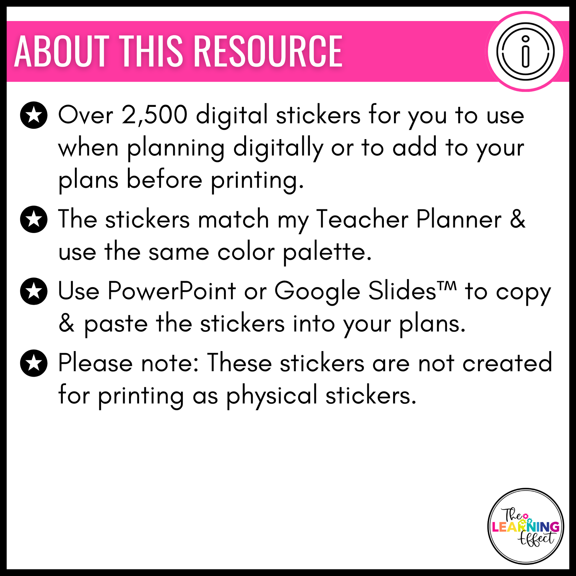 If you love using stickers in your teacher planner but want to go digital, this is a resource you need! Digital stickers are an easy way to customize your teacher planner or calendar before printing or when planning digitally. Simply copy and paste from your sticker book file into your planner and you're ready to go. All stickers are high quality, so printing them on your planner will look great!