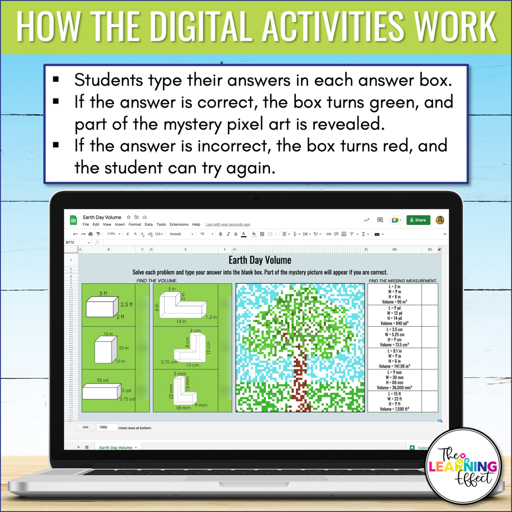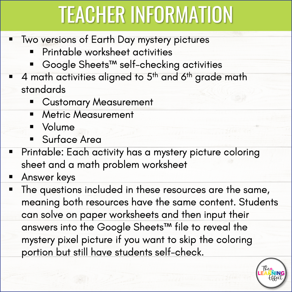 Keeping Earth Day educational doesn't have to be a hassle! Students can practice math skills in a fun, engaging way with solve and color worksheets and mystery pixel art for Google Sheets. The skills covered in this resource are customary and metric measurement, volume, and surface area. Perfect for the spring months, Earth Day, or enrichment.