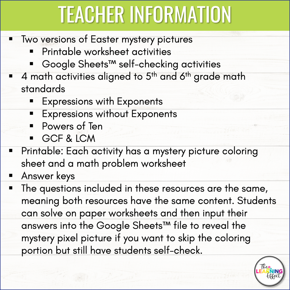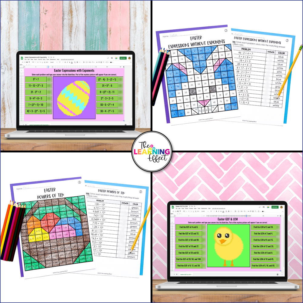 Keeping Easter educational doesn't have to be a hassle! Students can practice math skills in a fun, engaging way with solve and color worksheets and mystery pixel art for Google Sheets. The skills covered in this resource are expressions with exponents, expressions without exponents, powers of ten, and greatest common factors and least common multiples. Perfect for the spring months, Easter, or enrichment.
