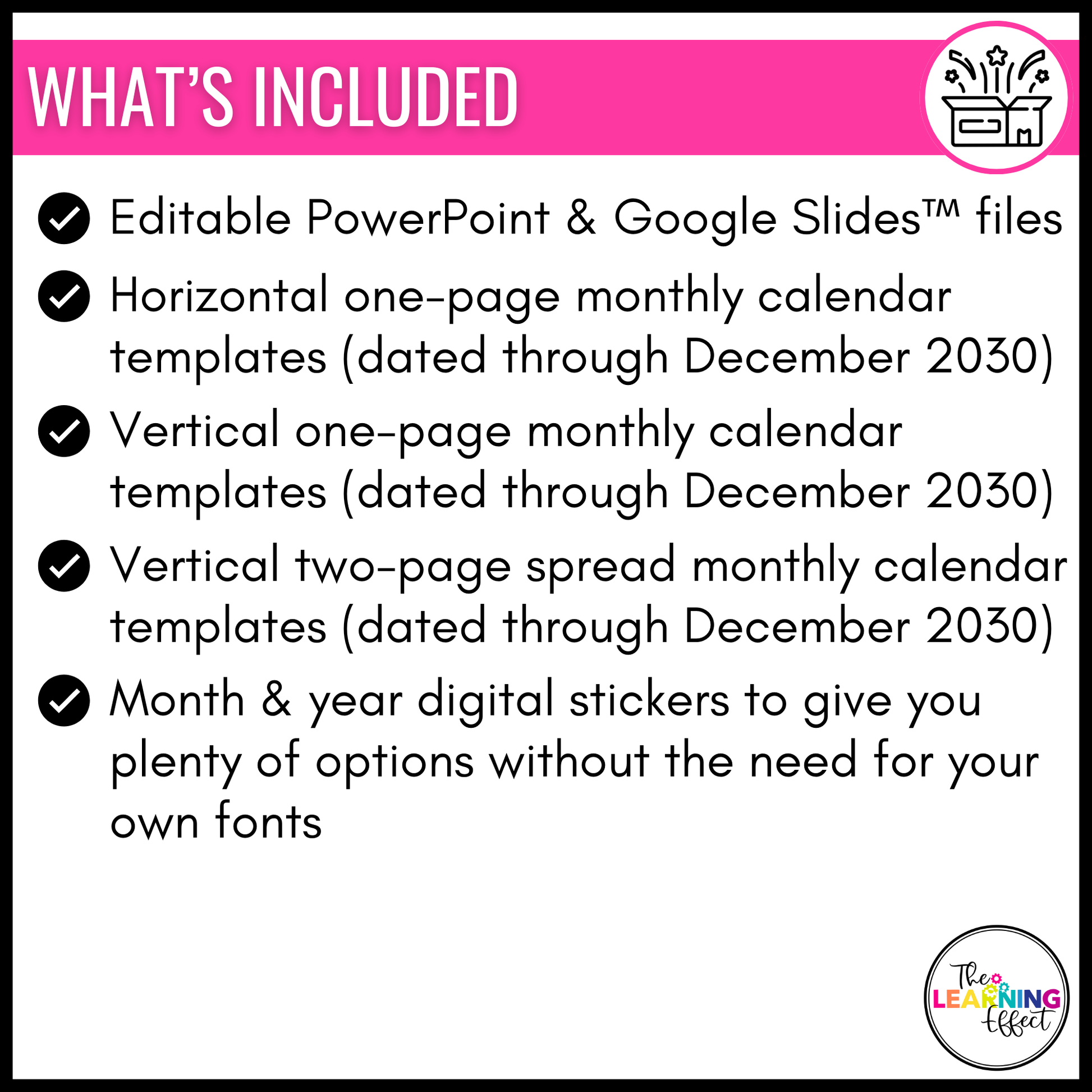 No need to buy a new calendar every year - this resource currently includes dated calendars through December 2030, and you'll receive free updates when future years are added!