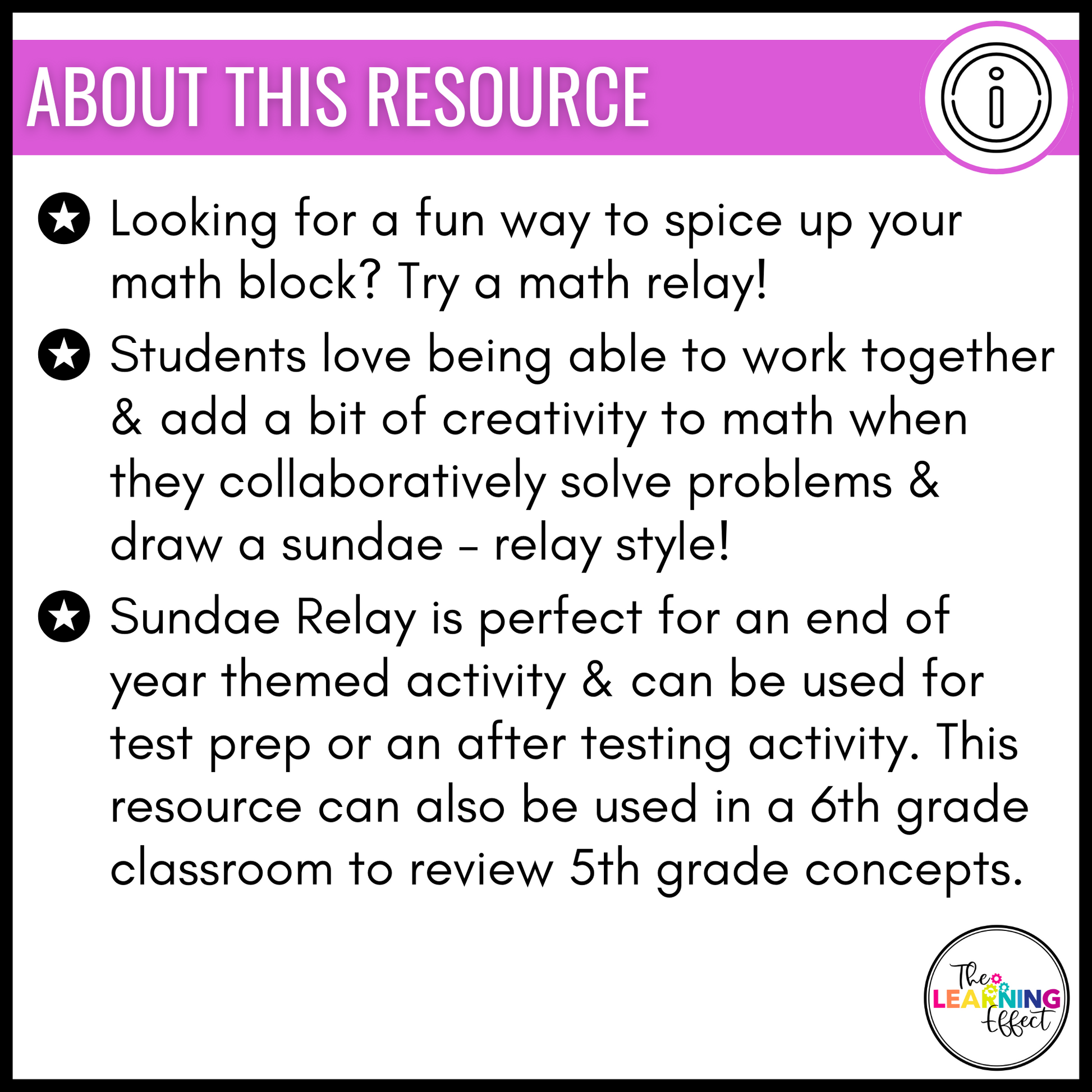 Sundae Relay is perfect for an end of year themed activity and can be used for test prep or an after testing activity. This resource can also be used in a 6th grade classroom to review 5th grade concepts. There are 8 rounds in this game, and it takes about an hour to complete.