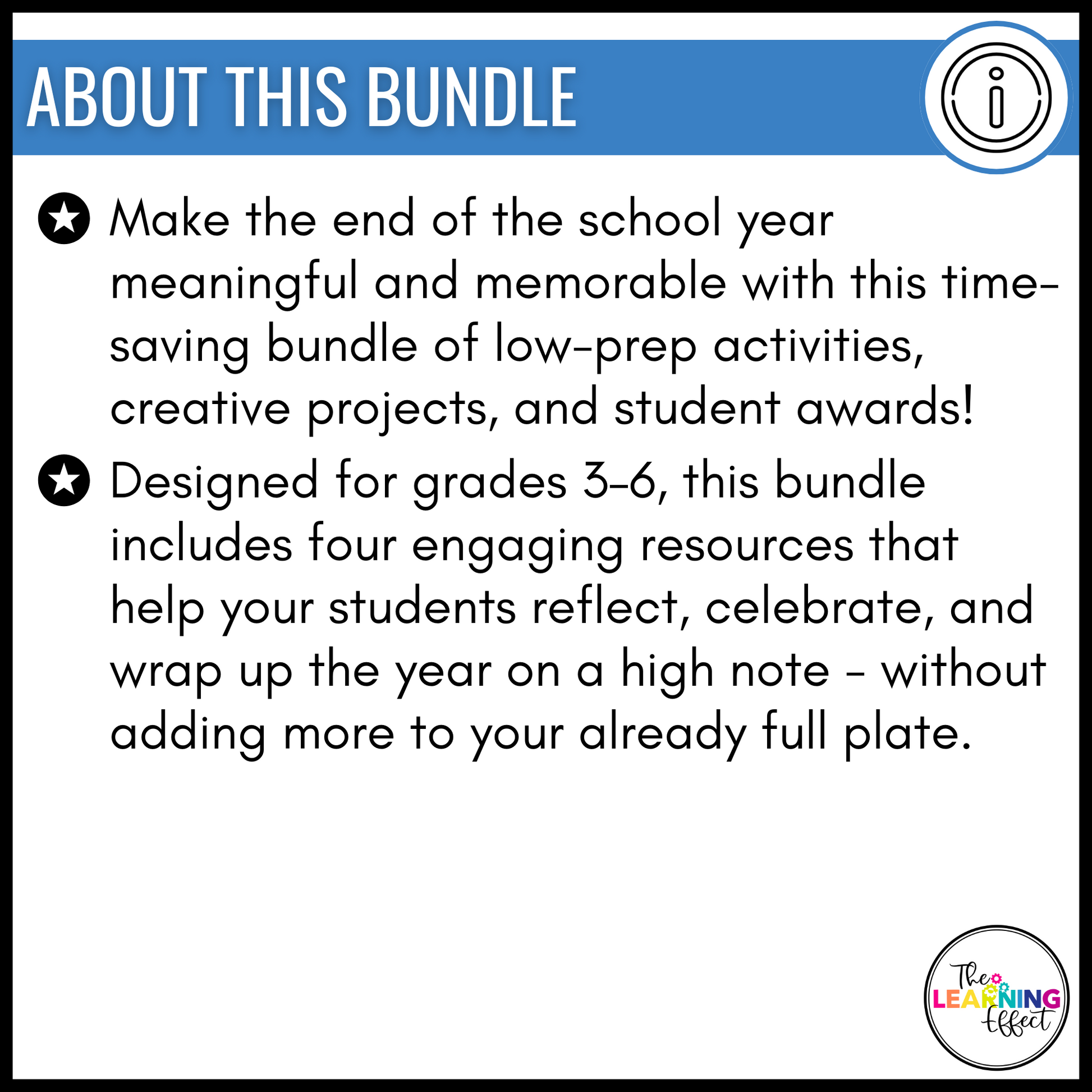 Make the end of the school year meaningful and memorable with this time-saving bundle of low-prep activities, creative projects, and student awards! Designed for grades 3–6, this bundle includes four engaging resources that help your students reflect, celebrate, and wrap up the year on a high note - without adding more to your already full plate.