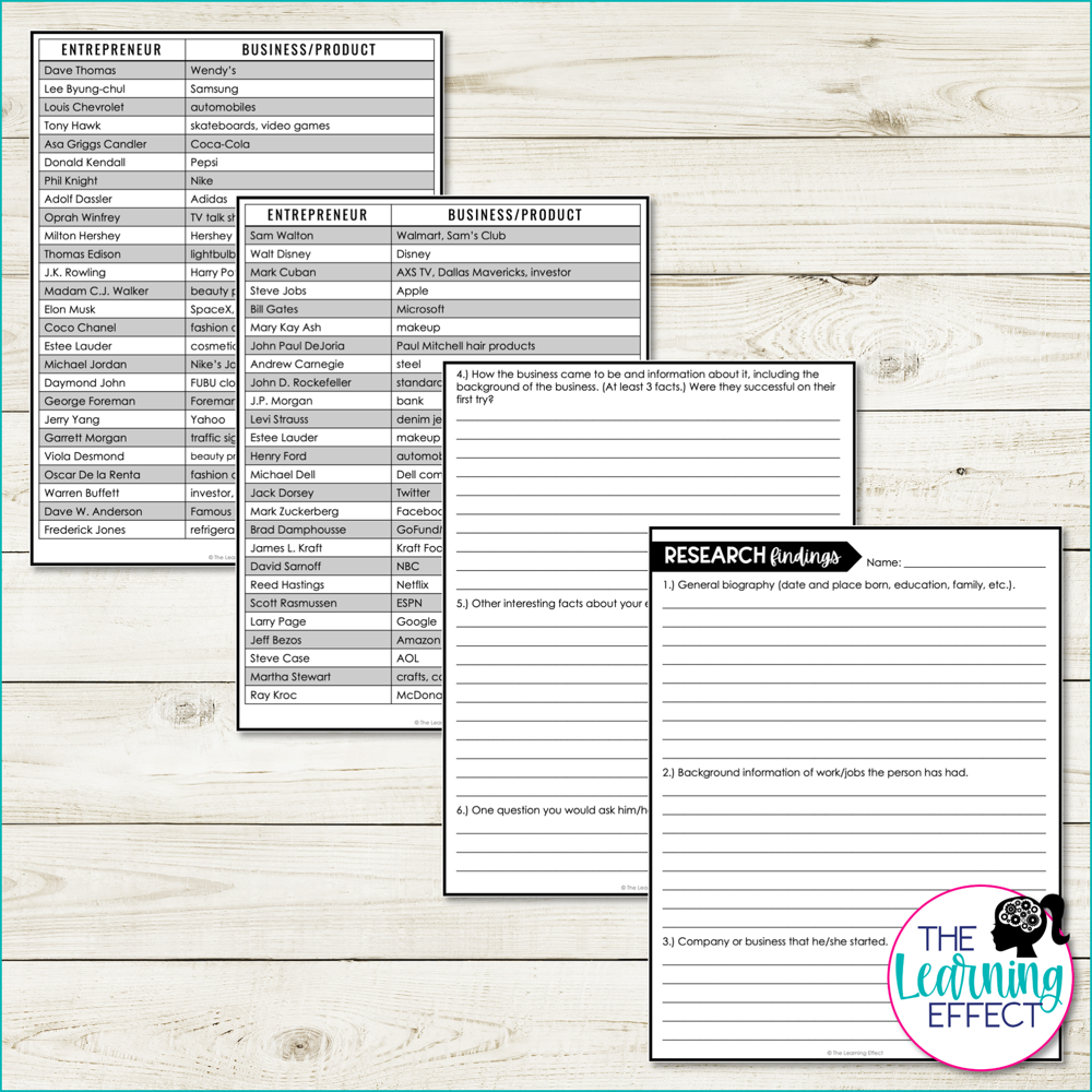 - Editable Google Slides file with instructions, note-taking pages, resources for research, grading rubric, list of entrepreneurs, presentation sign up (can be downloaded as a PowerPoint if you’d like to use that software instead)