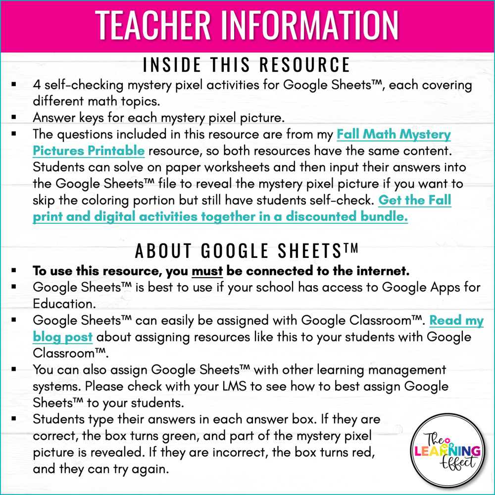 Students can practice math skills in a fun, engaging way with mystery pixel art for Google Sheets. The skills covered in this resource are decimal place value, multiplication of whole numbers, and division of whole numbers. Perfect for the fall/autumn months, back to school, Halloween, Thanksgiving, or enrichment.