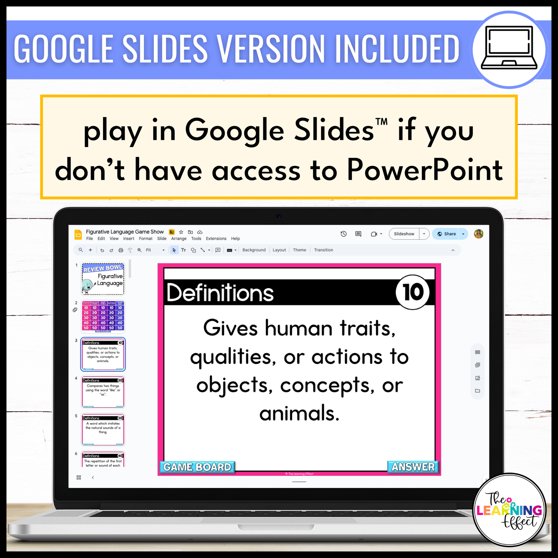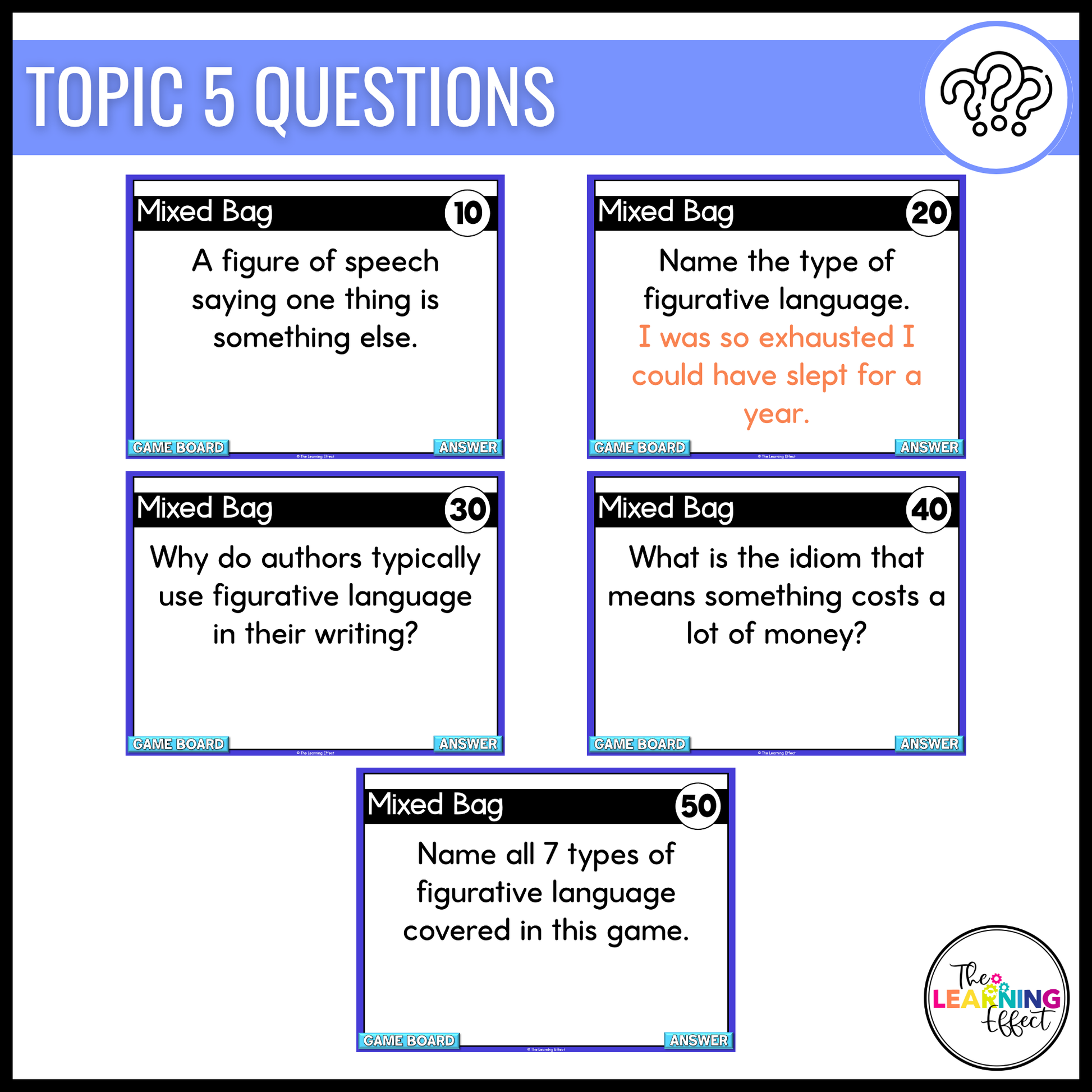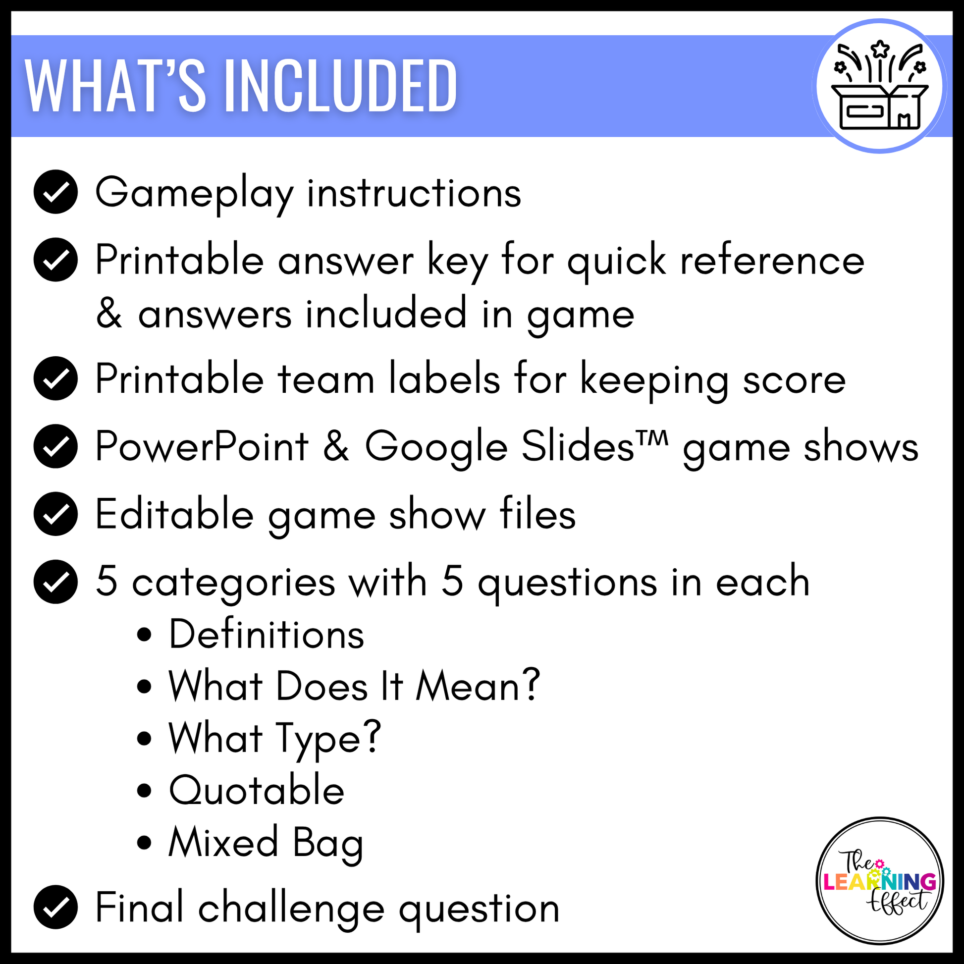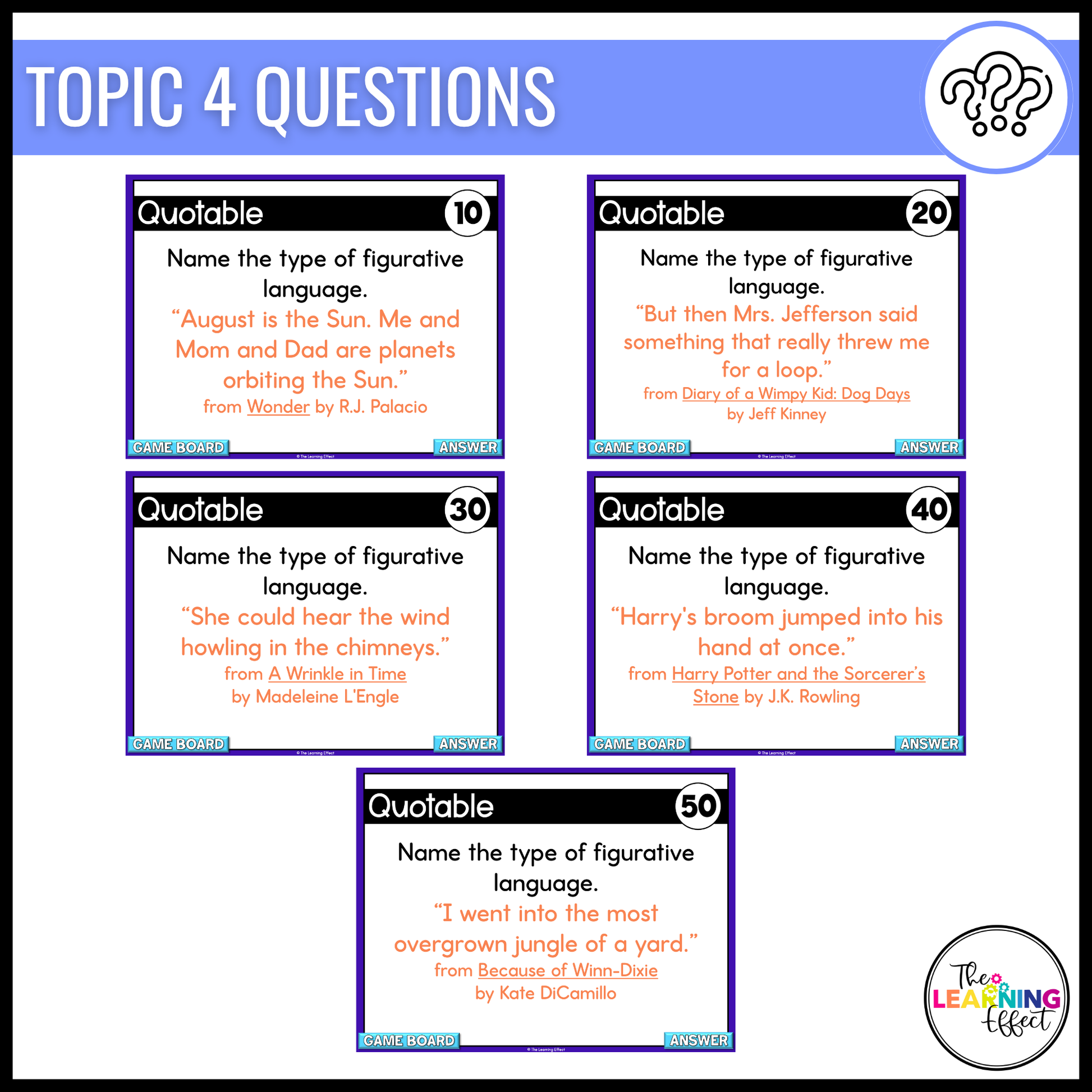 Make reviewing Figurative Language fun and interactive with this Jeopardy-style game, designed for upper elementary students. This game covers ELA skills like similes, metaphors, personification, onomatopoeia, alliteration, hyperbole, and idioms, making it a great choice for end-of-unit or end-of-year review.