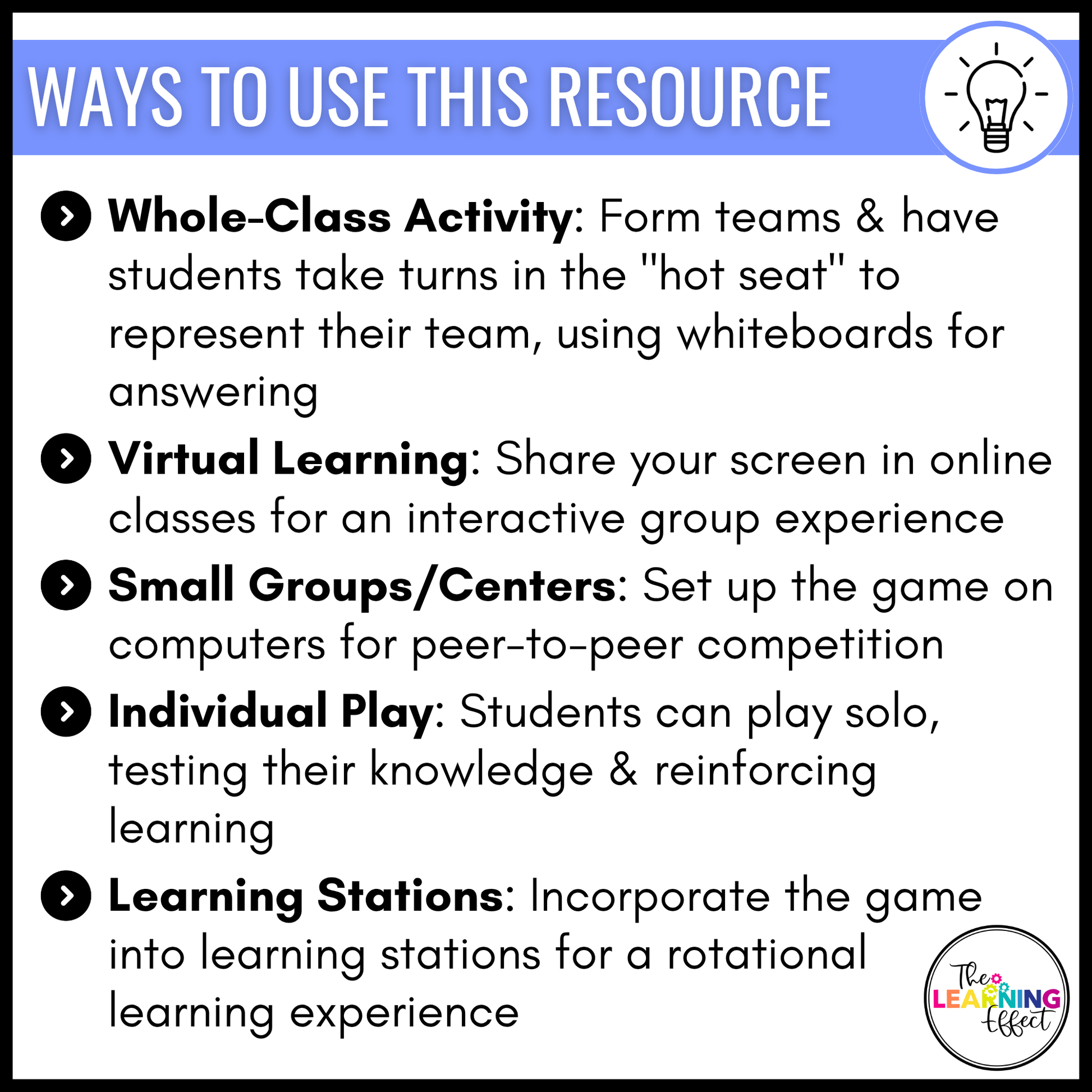 - Learning Stations: Incorporate the game into learning stations for a rotational learning experience
