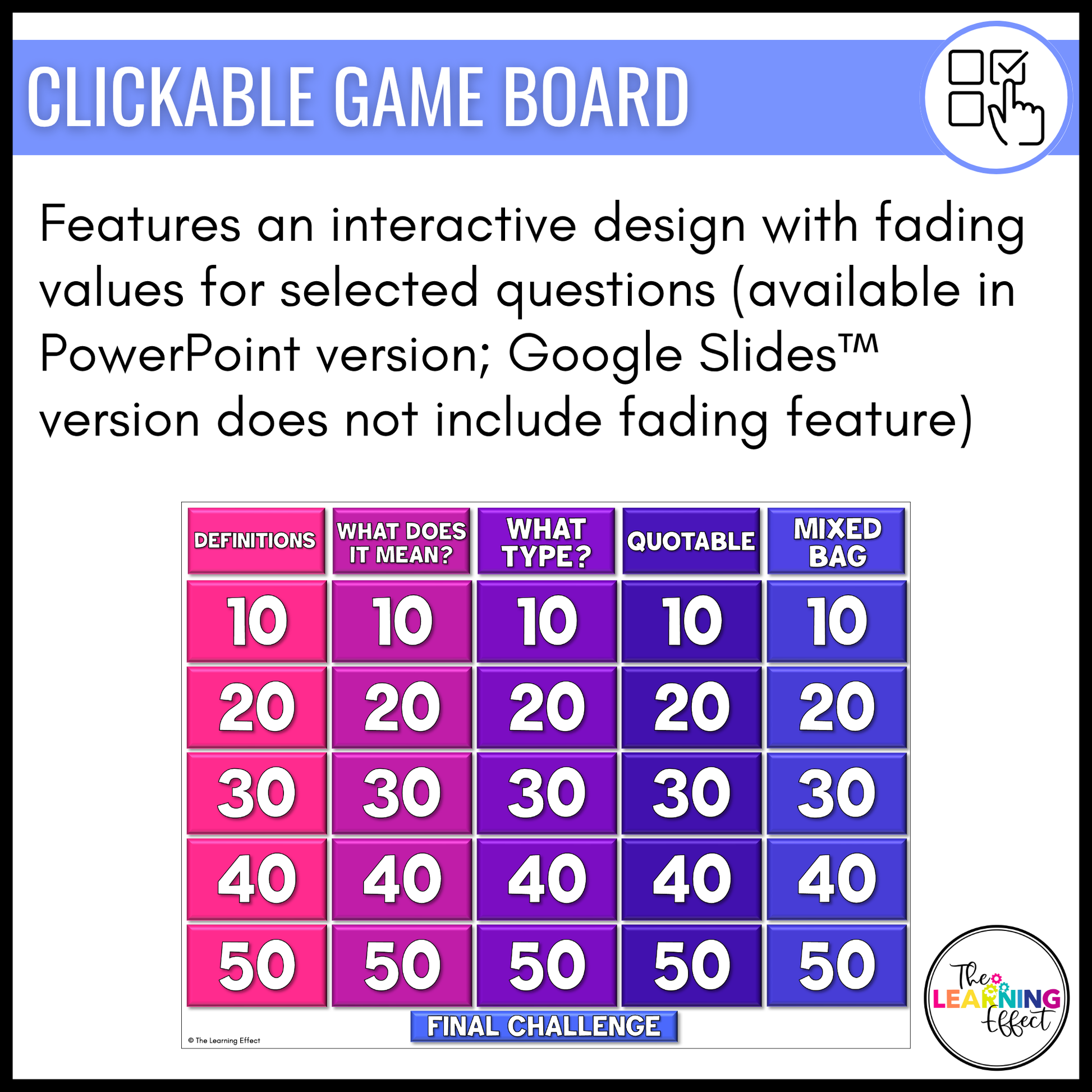 - Interactive Game Board: Features an interactive design with fading values for selected questions (available in PowerPoint version; Google Slides version does not support fading feature)