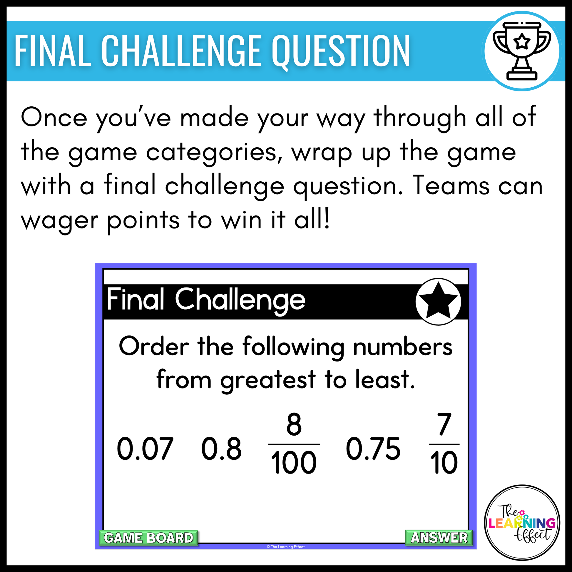 Review Fractions and Decimals in a fun and interactive way that involves your whole class. This engaging game show plays like Jeopardy® and covers 4th grade math skills, including tenths, hundredths, decimals and fractions, adding fractions and decimals, and comparing and ordering decimals. Perfect for an end of year or end of unit review.