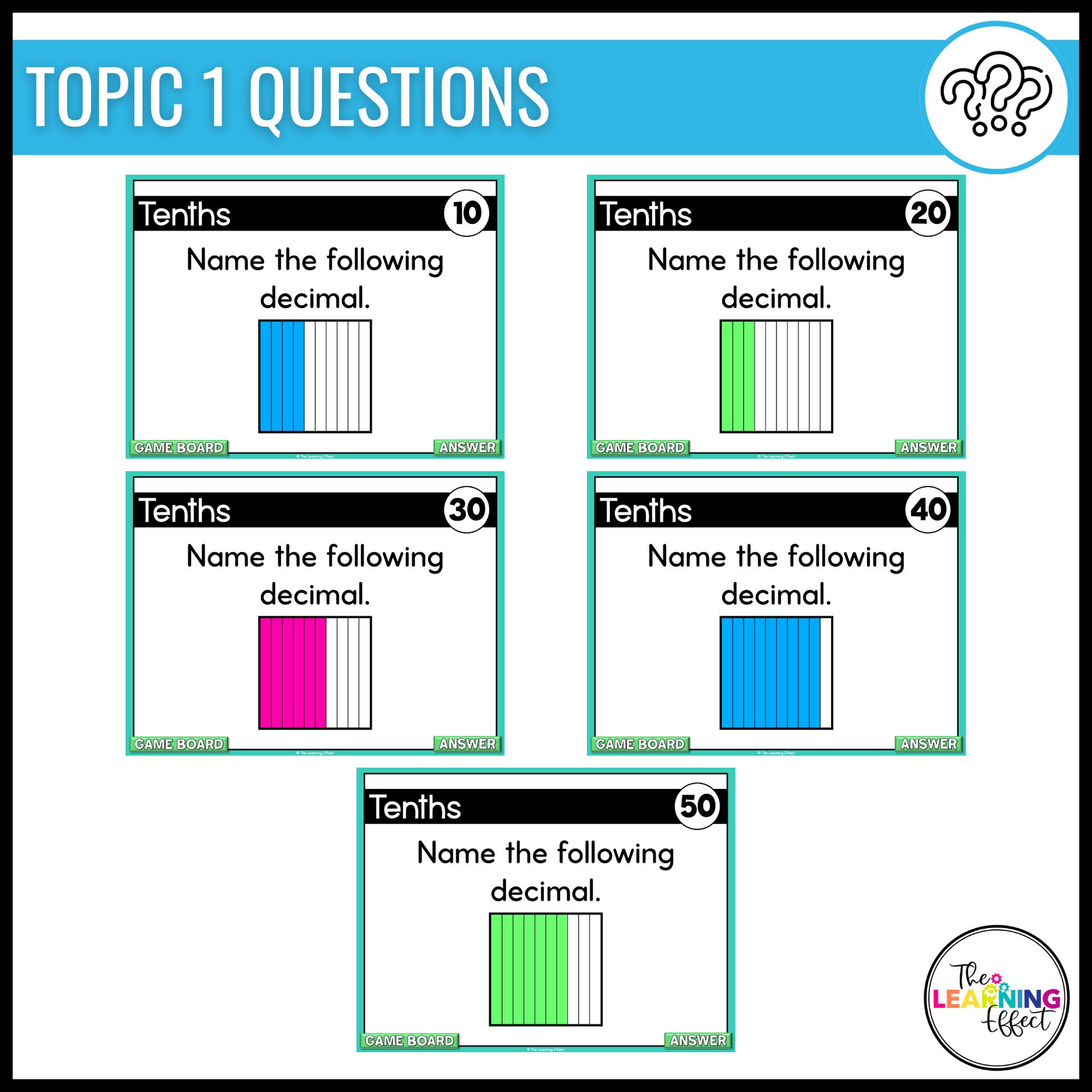 - Clickable, Jeopardy-style game board that fades values that have been chosen (only the PowerPoint version fades values)