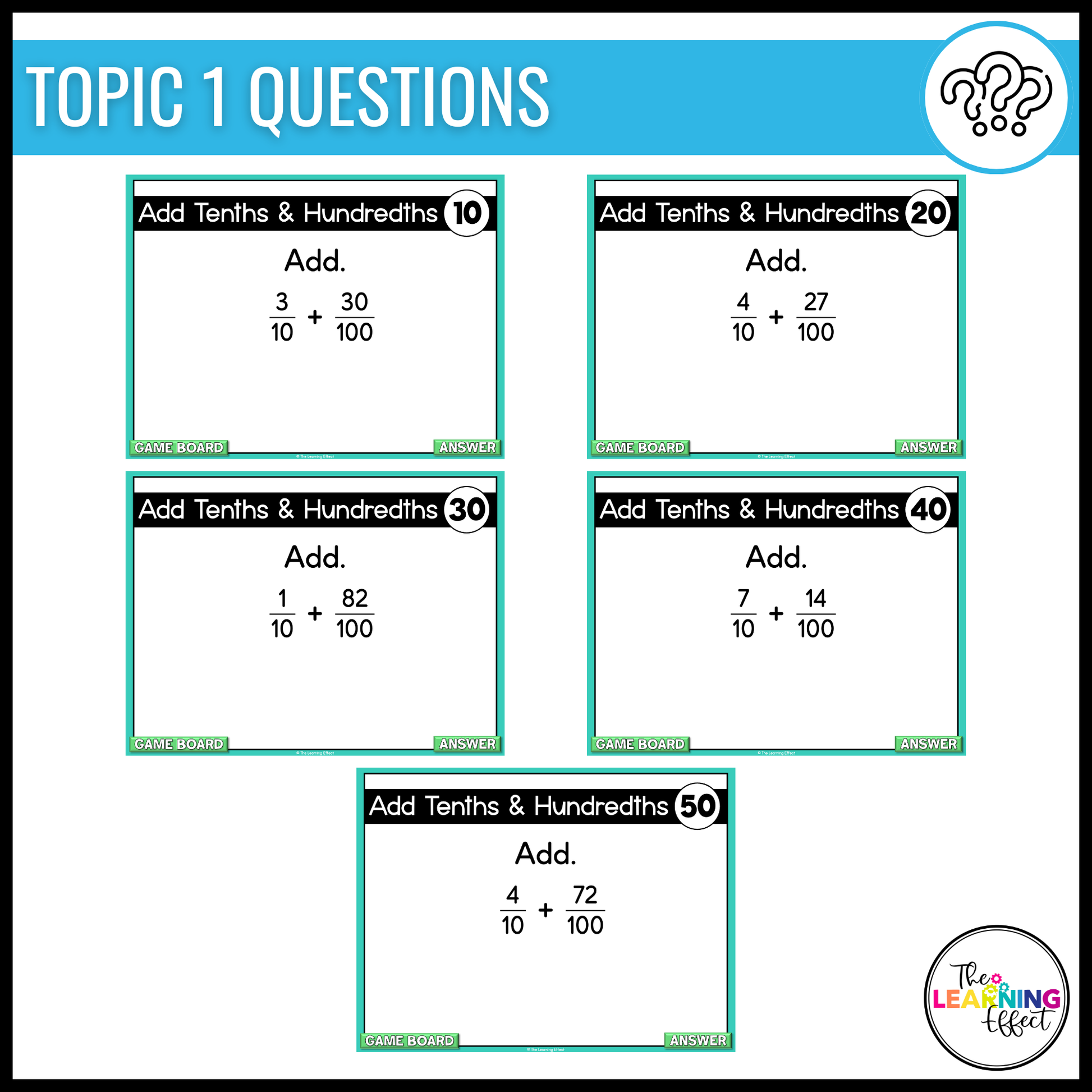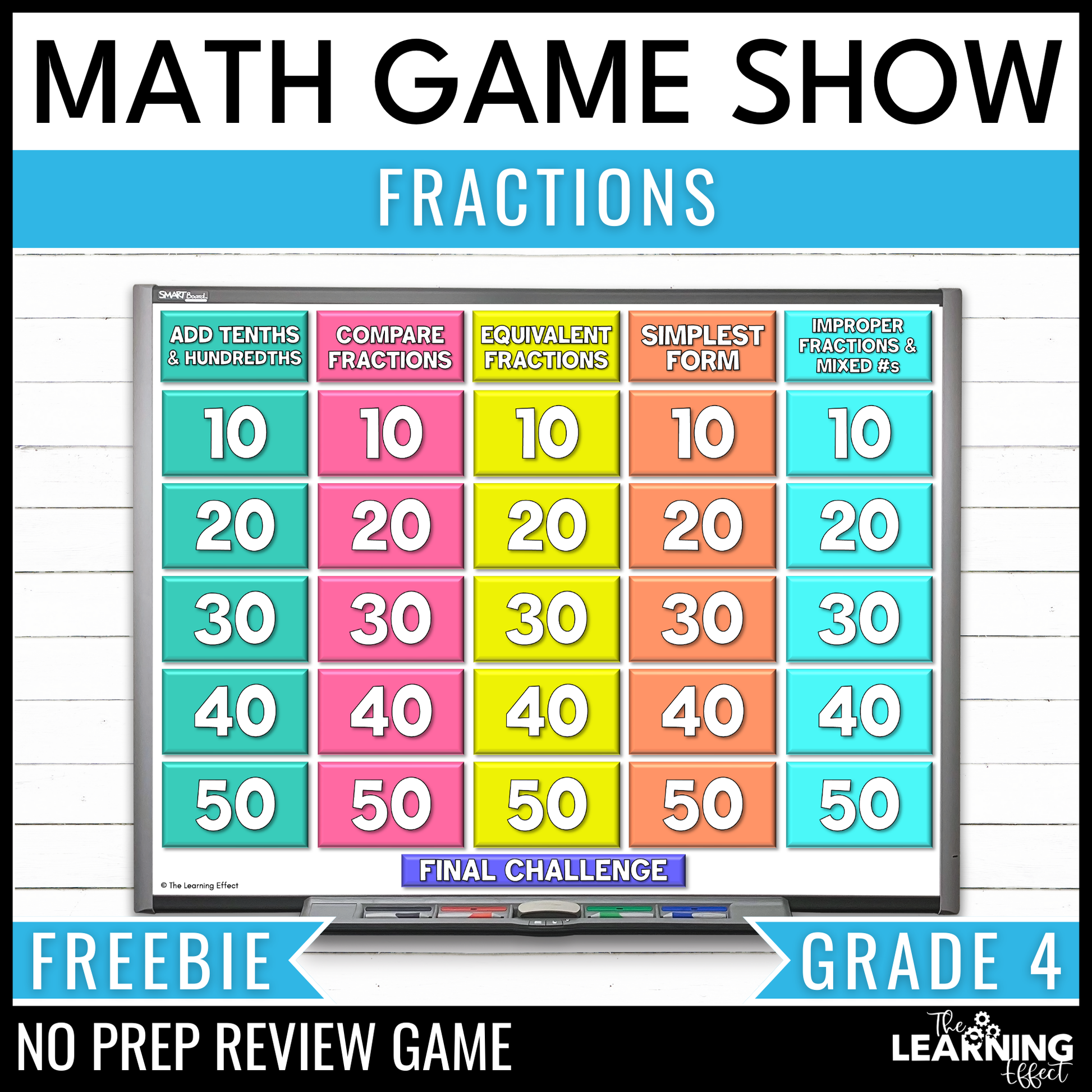 Make reviewing Fractions fun and interactive with this Jeopardy-style game, designed for 4th grade students. This game covers math skills like adding tenths and hundredths, comparing fractions, equivalent fractions, simplest form, improper fractions, and mixed numbers, making it a great choice for end-of-unit or end-of-year review.