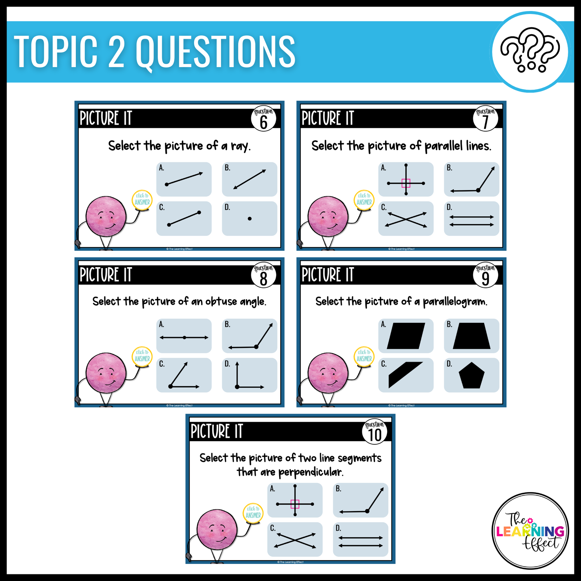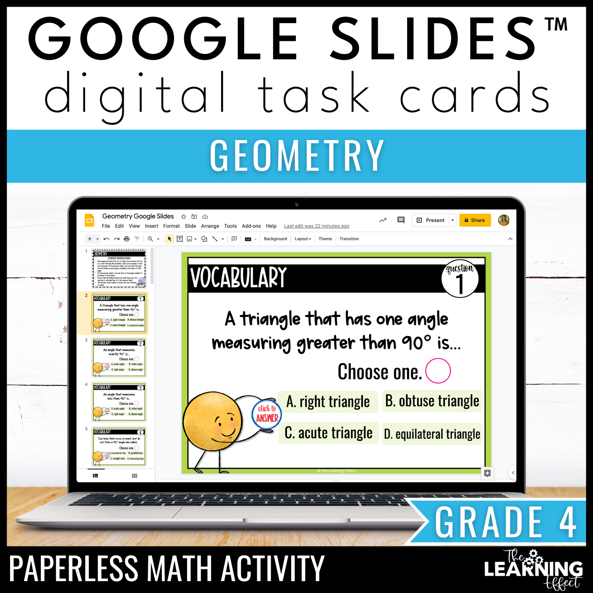 Make practicing Geometry engaging and stress-free with these Google Slides task cards. This activity covers 4th grade math skills like vocabulary, picture it, geometric figures, symmetry, and angles, making it perfect for independent practice, small group work, whole-class review, or test prep.