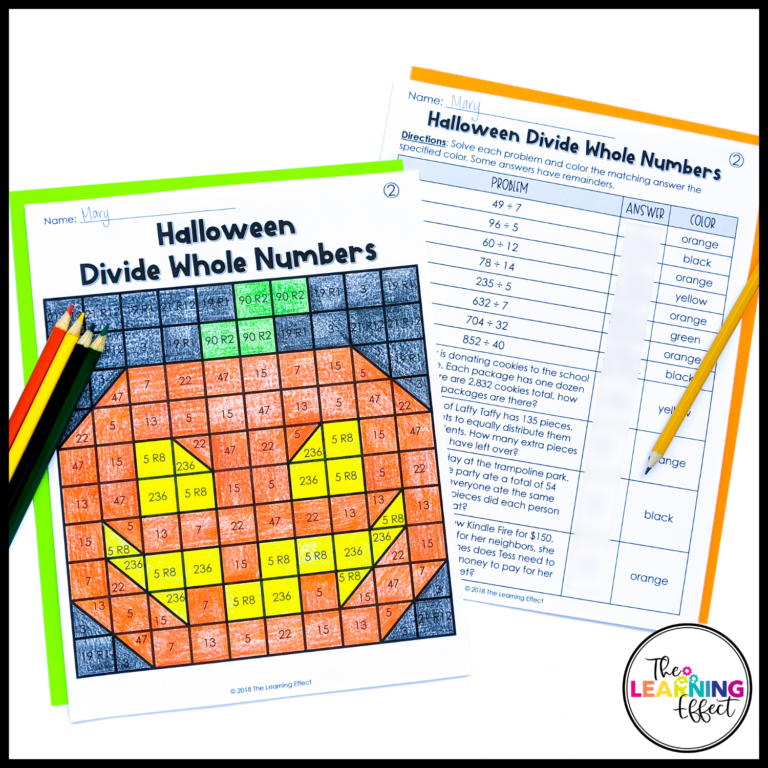 - A color by number worksheet where students color the answers to complete a Halloween-themed image.