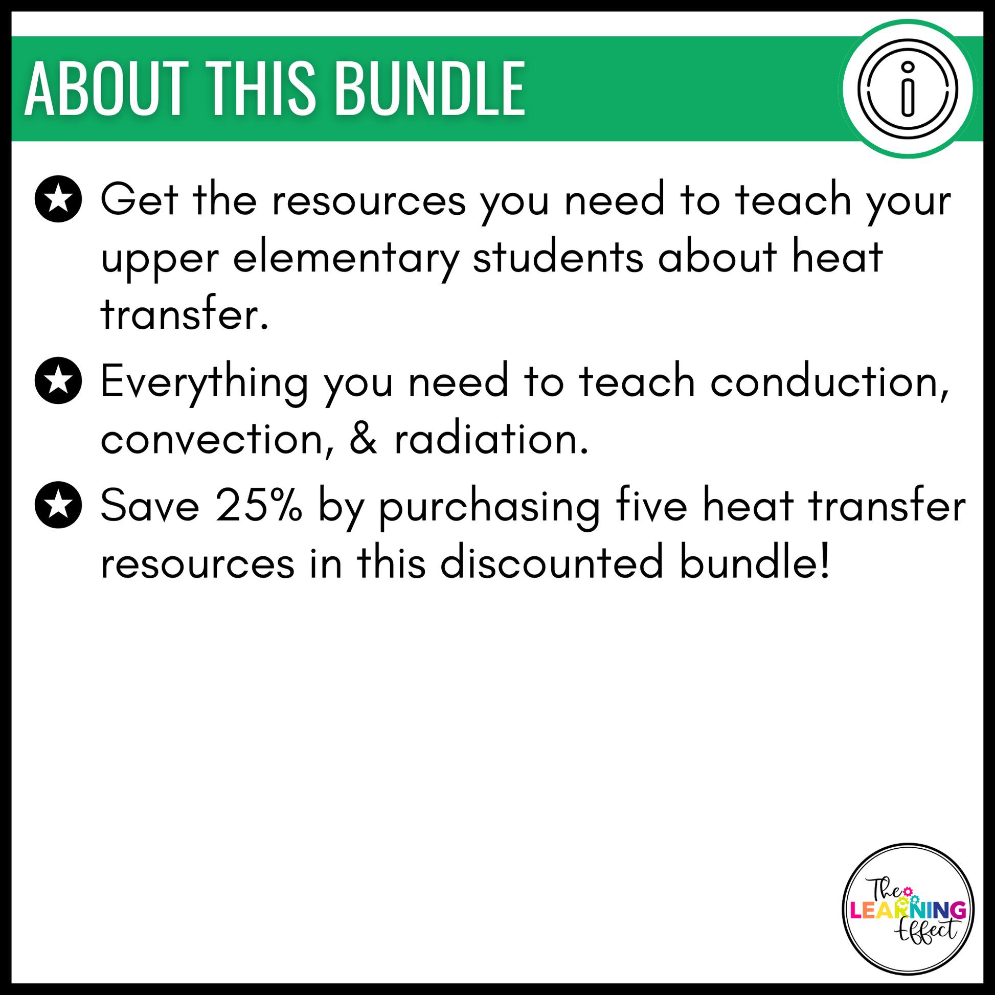 Get the resources you need to teach your upper elementary students about heat transfer. Everything you need to teach conduction, convection, and radiation. This bundle includes a lesson with guided notes, vocabulary word wall cards and quiz, a sort activity, a comic activity, and a game show.