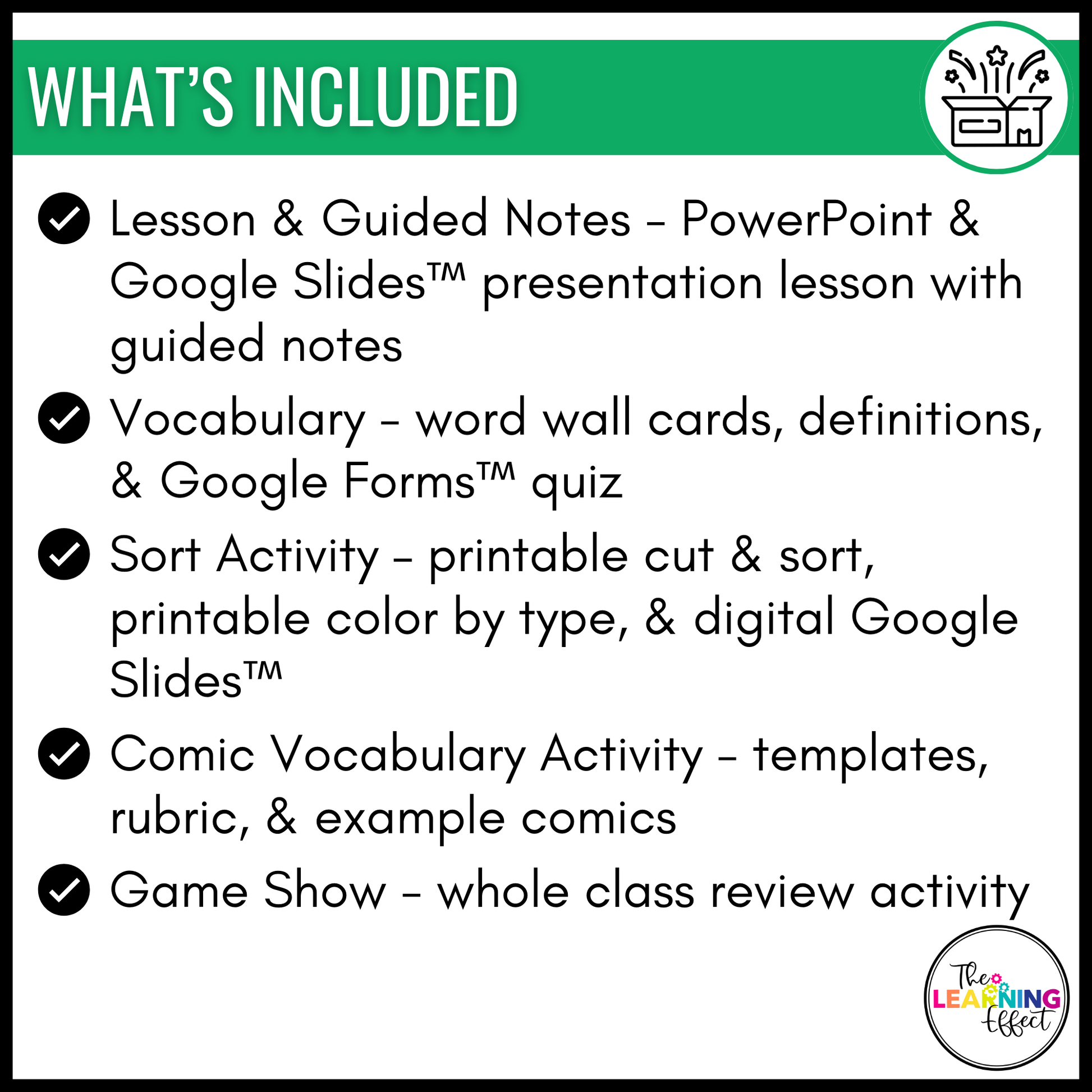 - 7 vocabulary cards with term, definition, and image (print 3-per-page)