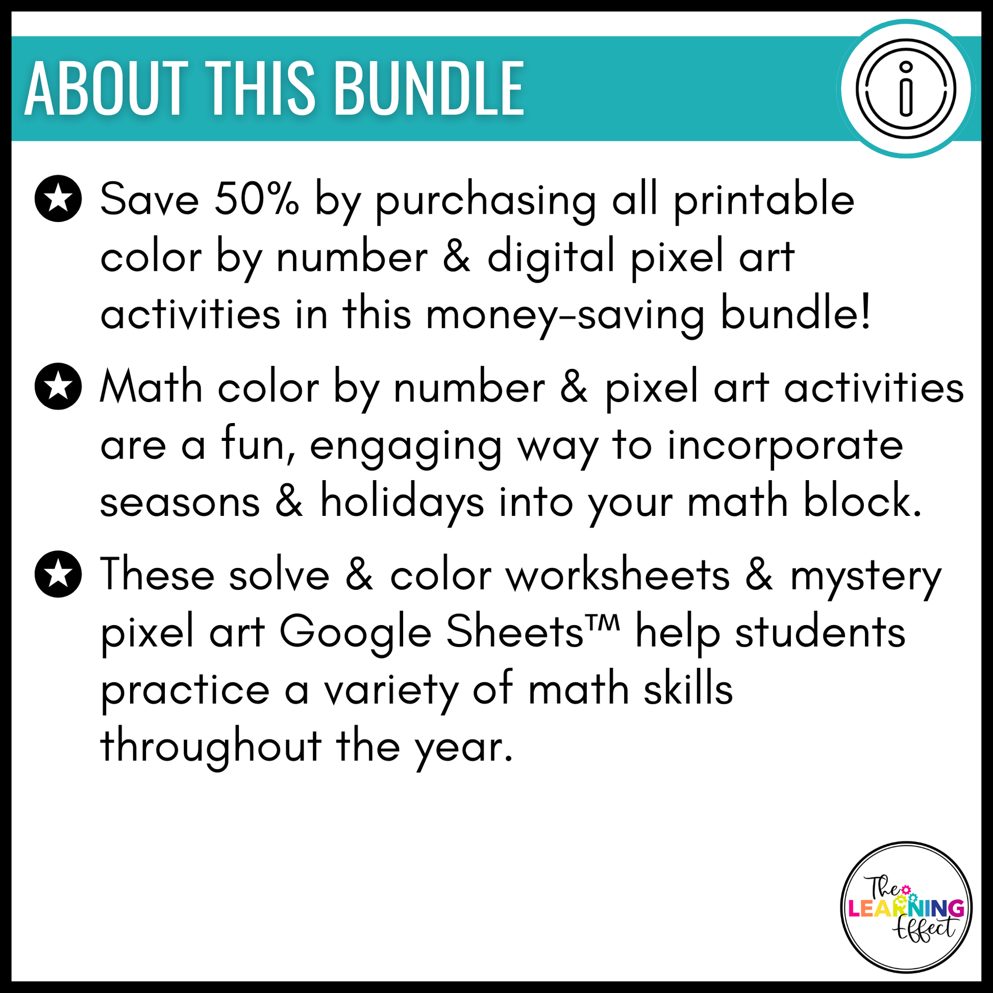 Each seasonal resource includes four math activities aligned to key math skills, combining standards-aligned practice with engaging seasonal themes. Students can solve the problems on paper and color their answers, or input them into Google Sheets to self-check and reveal a mystery pixel picture.
