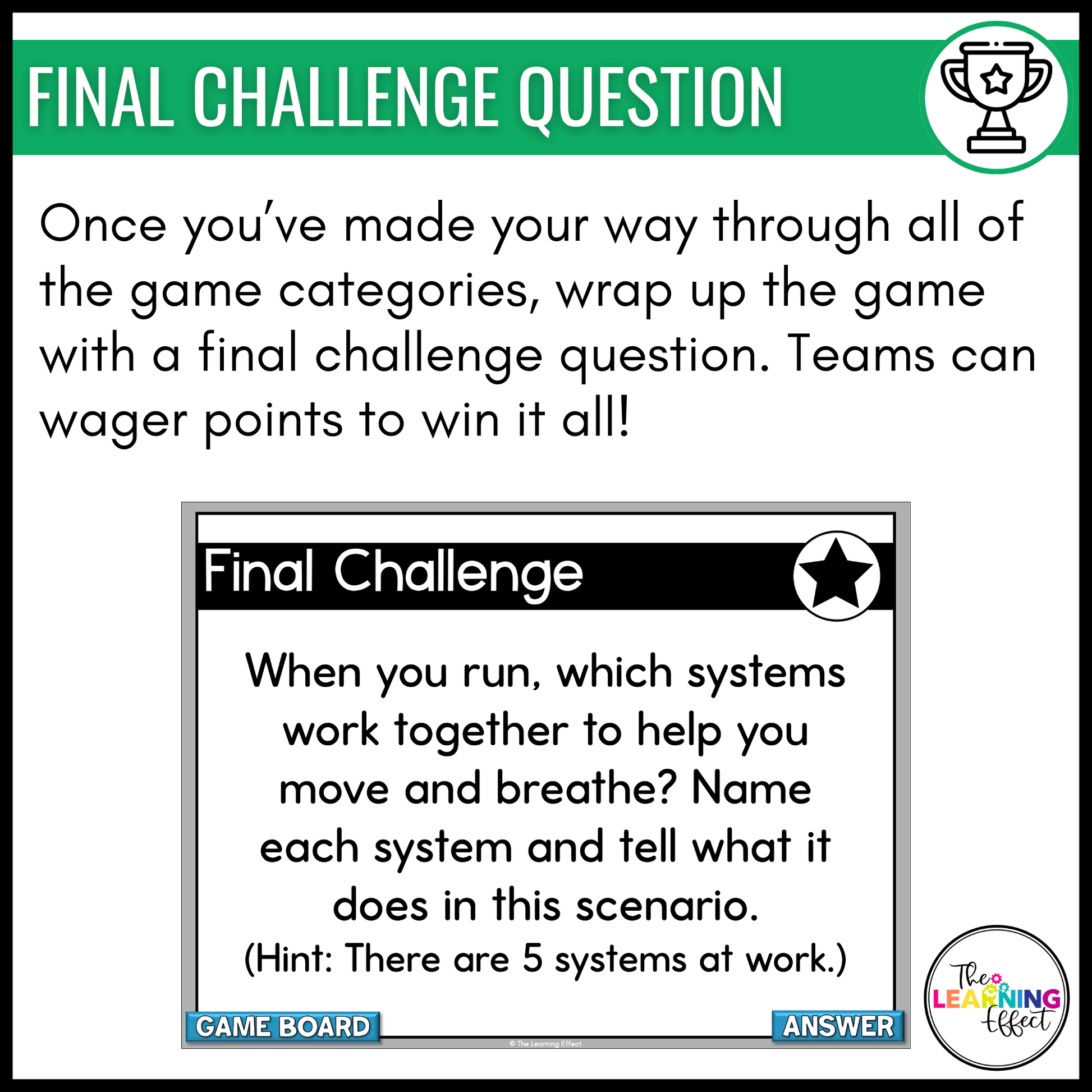 Review Human Body Systems with a Jeopardy®-style game show! Created for upper elementary students, this interactive game show style resource transforms the classroom into an arena of knowledge and fun. This game is a great tool for teachers to review key topics in a format that students will enjoy, making learning interactive and memorable.