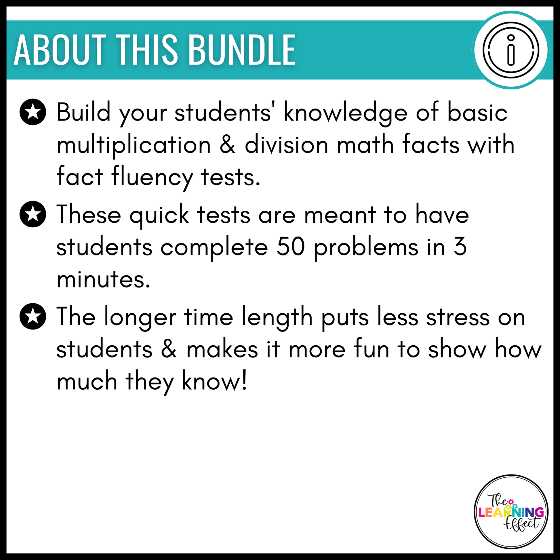 Build your students' knowledge of basic multiplication and division math facts with fact fluency tests. These quick tests are meant to have students complete 50 problems in 3 minutes. The longer time length puts less stress on students and makes it more fun to show how much they know! Save 25% by purchasing Multiplication Timed Tests and Division Timed Tests in this discounted bundle!