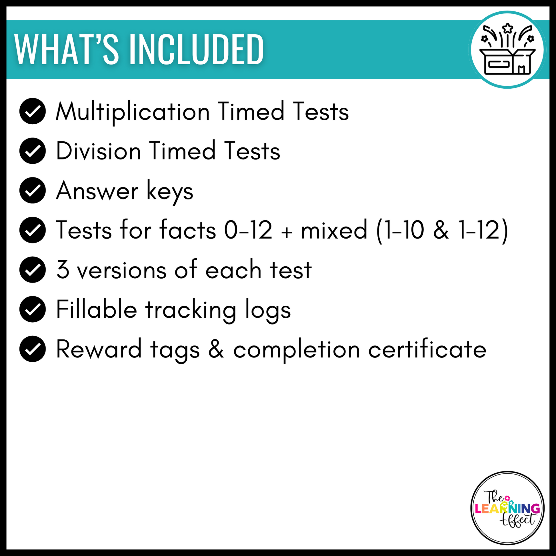 - Multiplication and division timed tests for 0-12 + mixed up (1-10 and 1-12), each with 3 versions