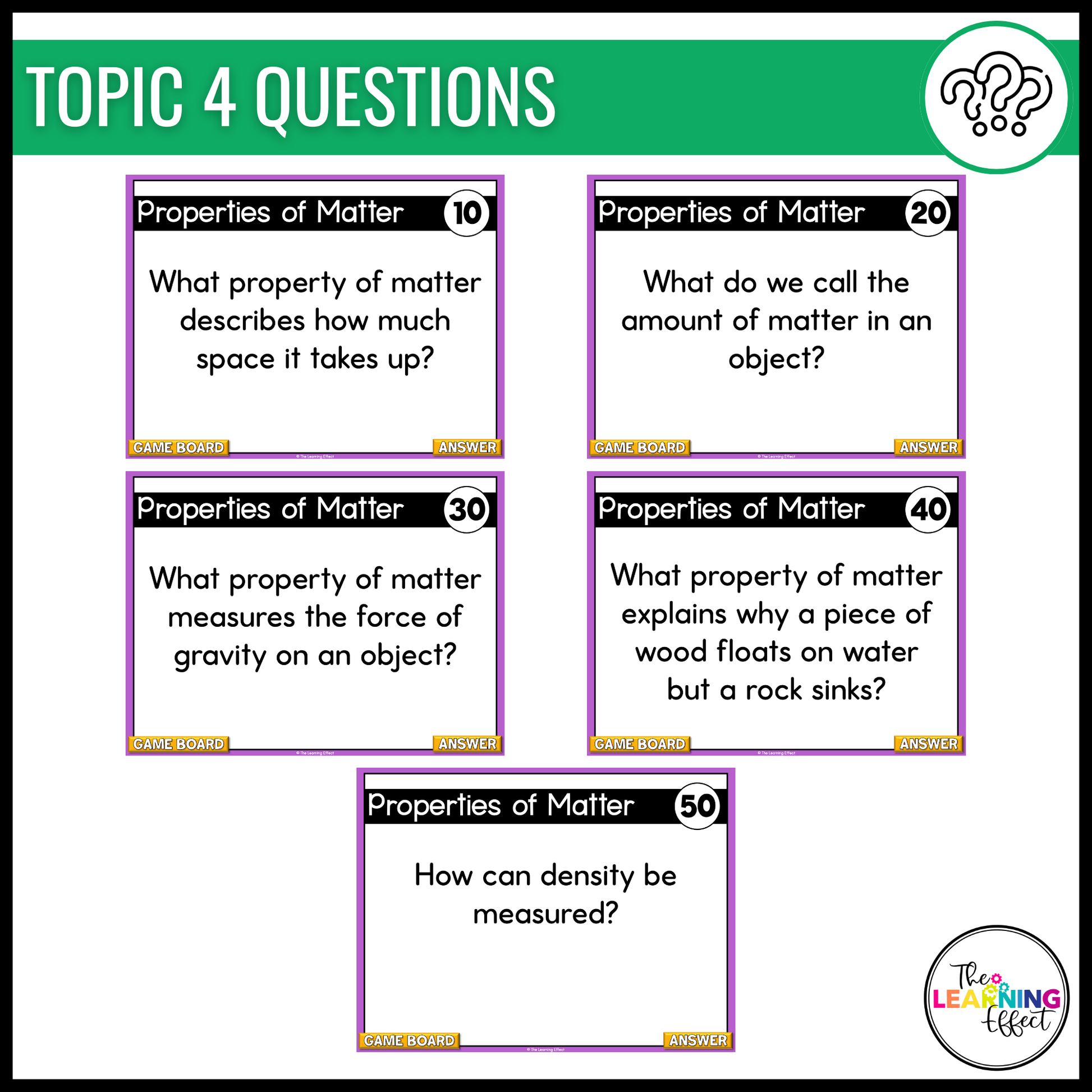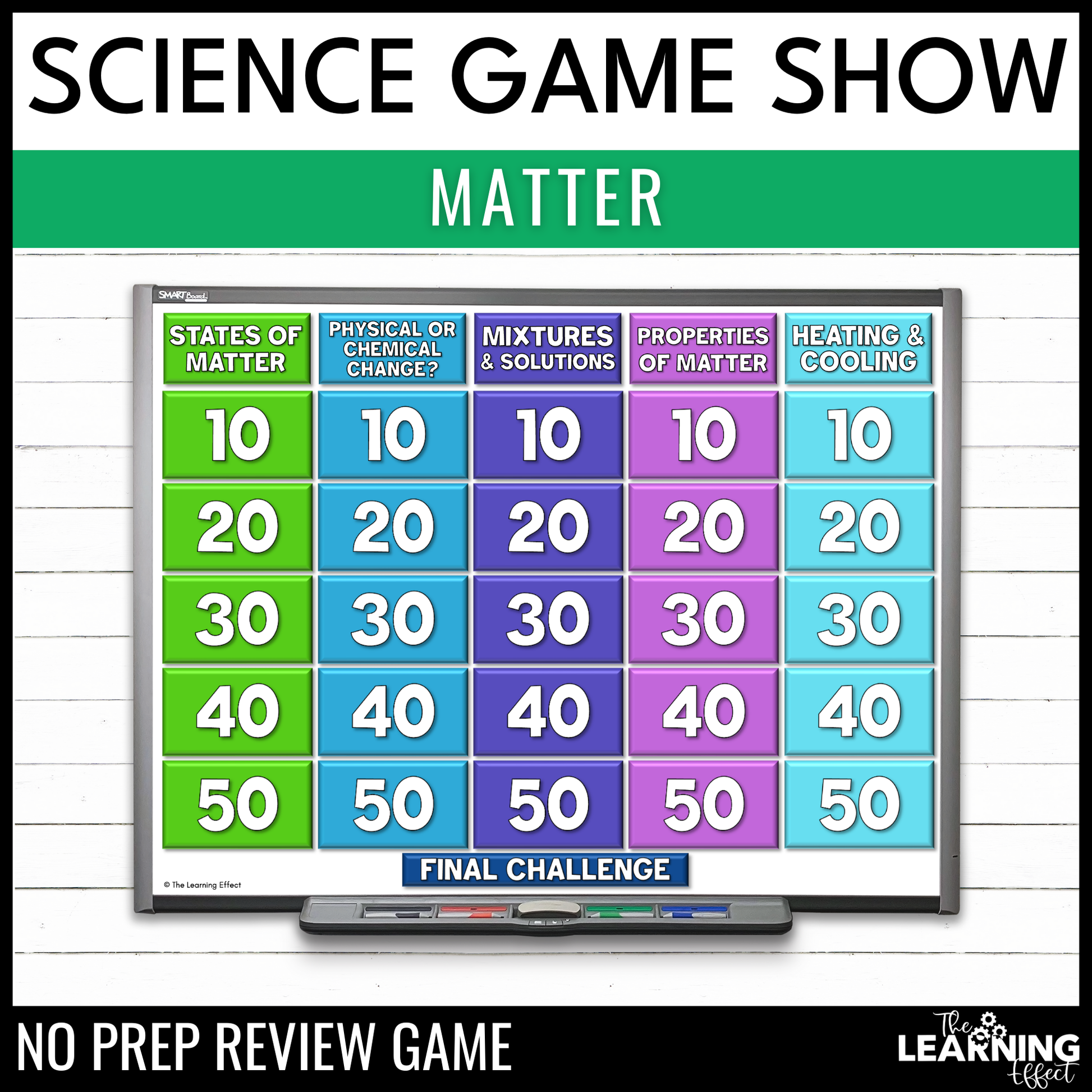 Review Matter with a Jeopardy®-style game show! Created for upper elementary students, this interactive game show style resource transforms the classroom into an arena of knowledge and fun. This game is a great tool for teachers to review key topics in a format that students will enjoy, making learning interactive and memorable.