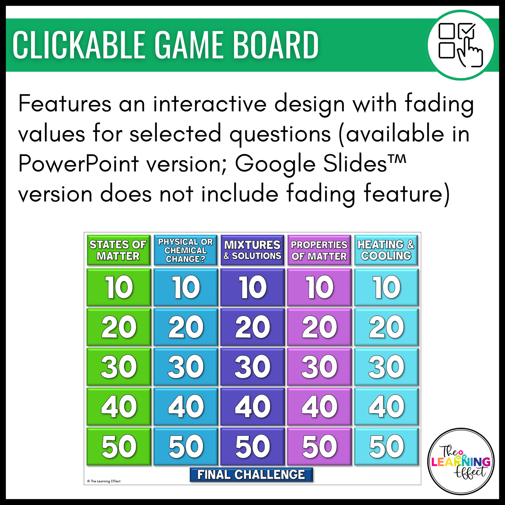 Clickable Game Board: Features an interactive design with fading values for selected questions (available in PowerPoint version; Google Slides version does not include fading feature)