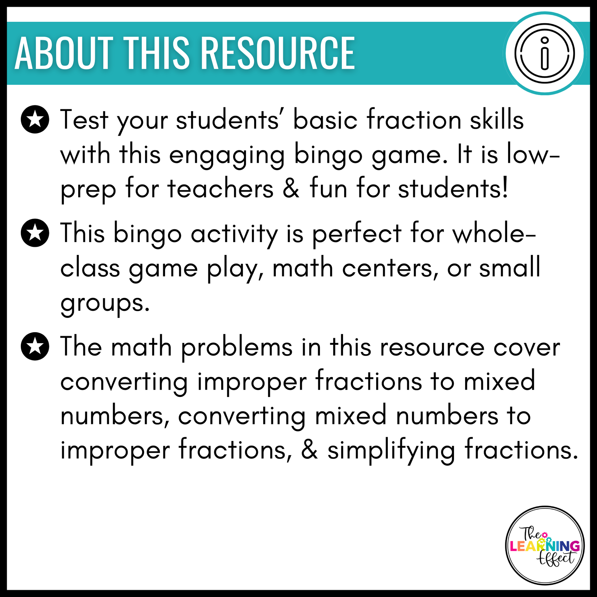 This bingo activity is perfect for whole-class game play, math centers, or small groups. The math problems in this resource cover converting improper fractions to mixed numbers, converting mixed numbers to improper fractions, and simplifying fractions. Perfect for 4th grade or 5th grade!