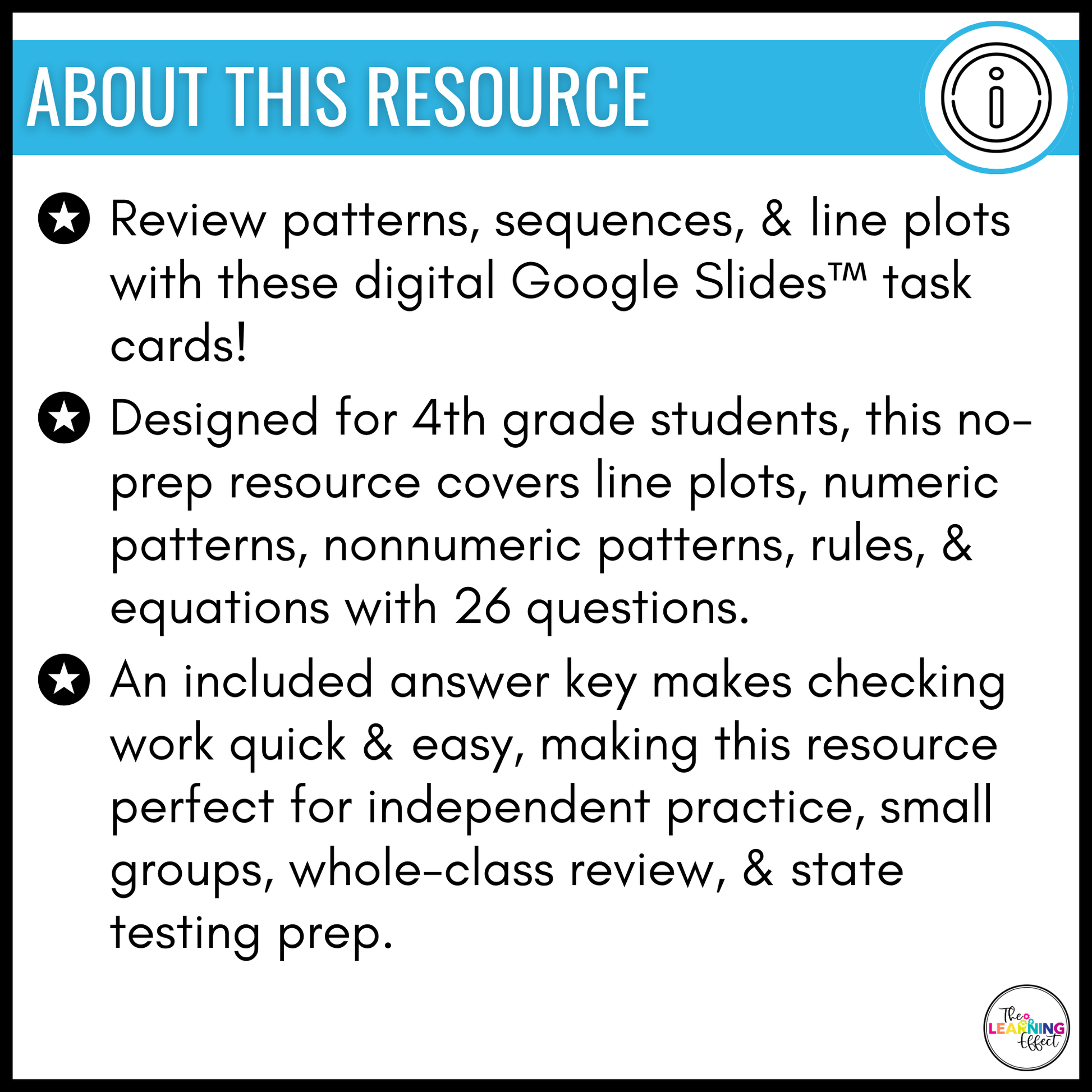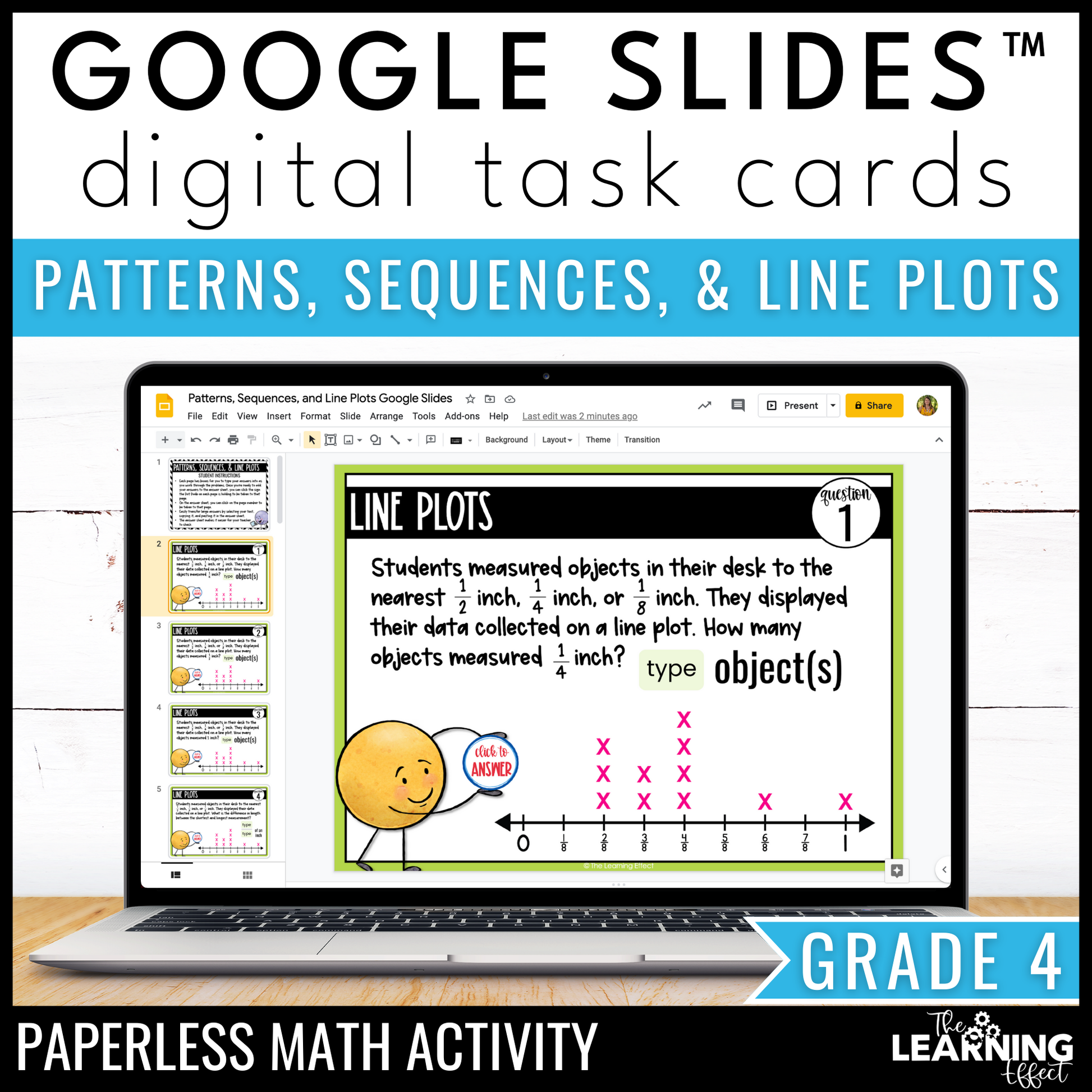Make practicing Patterns, Sequences, and Line Plots engaging and stress-free with these Google Slides task cards. This activity covers 4th grade math skills like line plots, numeric patterns, nonnumeric patterns, rules, and equations, making it perfect for independent practice, small group work, whole-class review, or test prep.