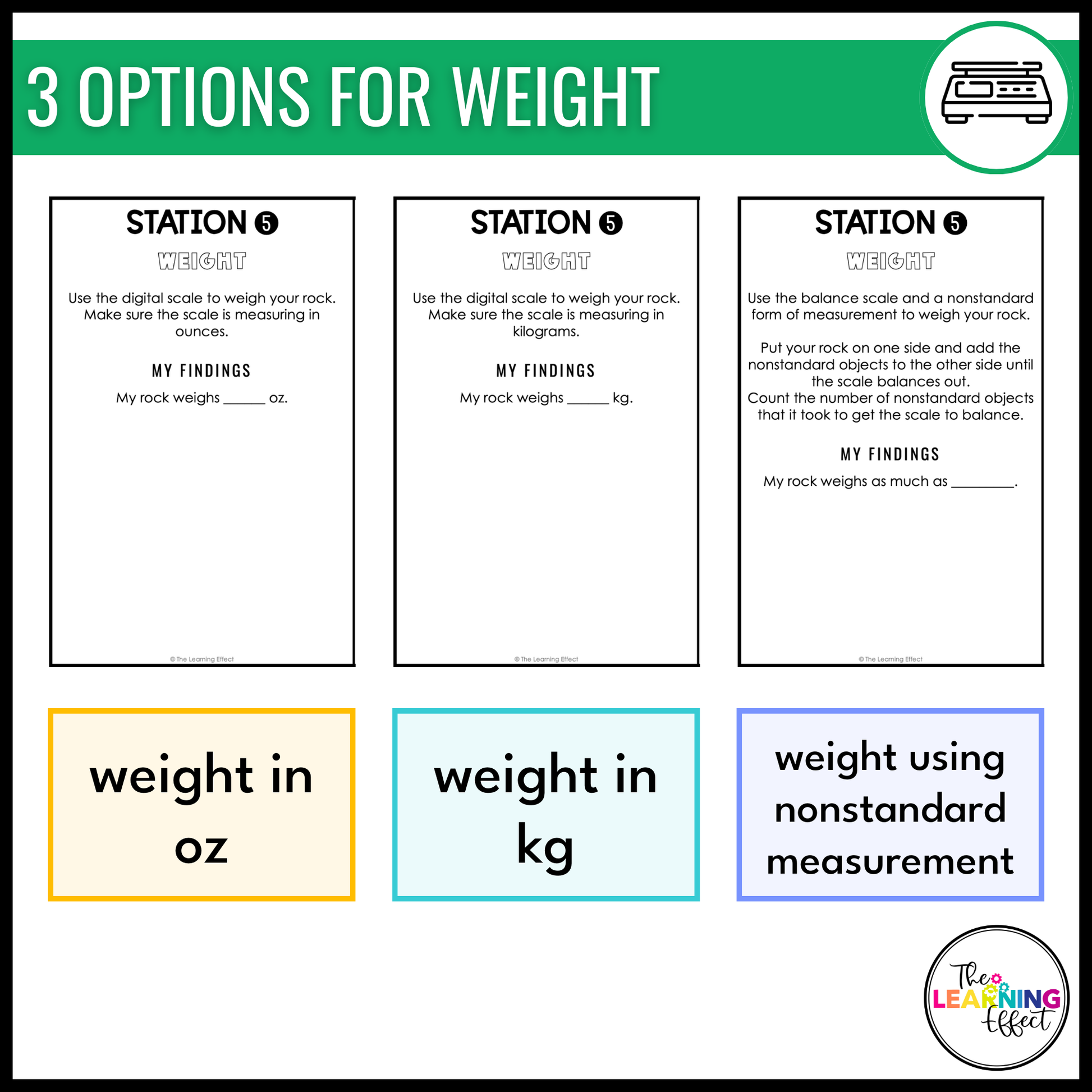 - The weight station includes 3 options - measuring in oz, kg, or nonstandard form of measurement