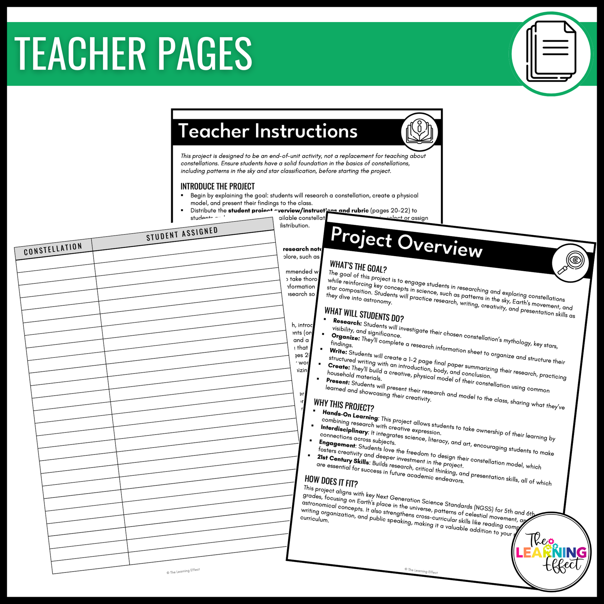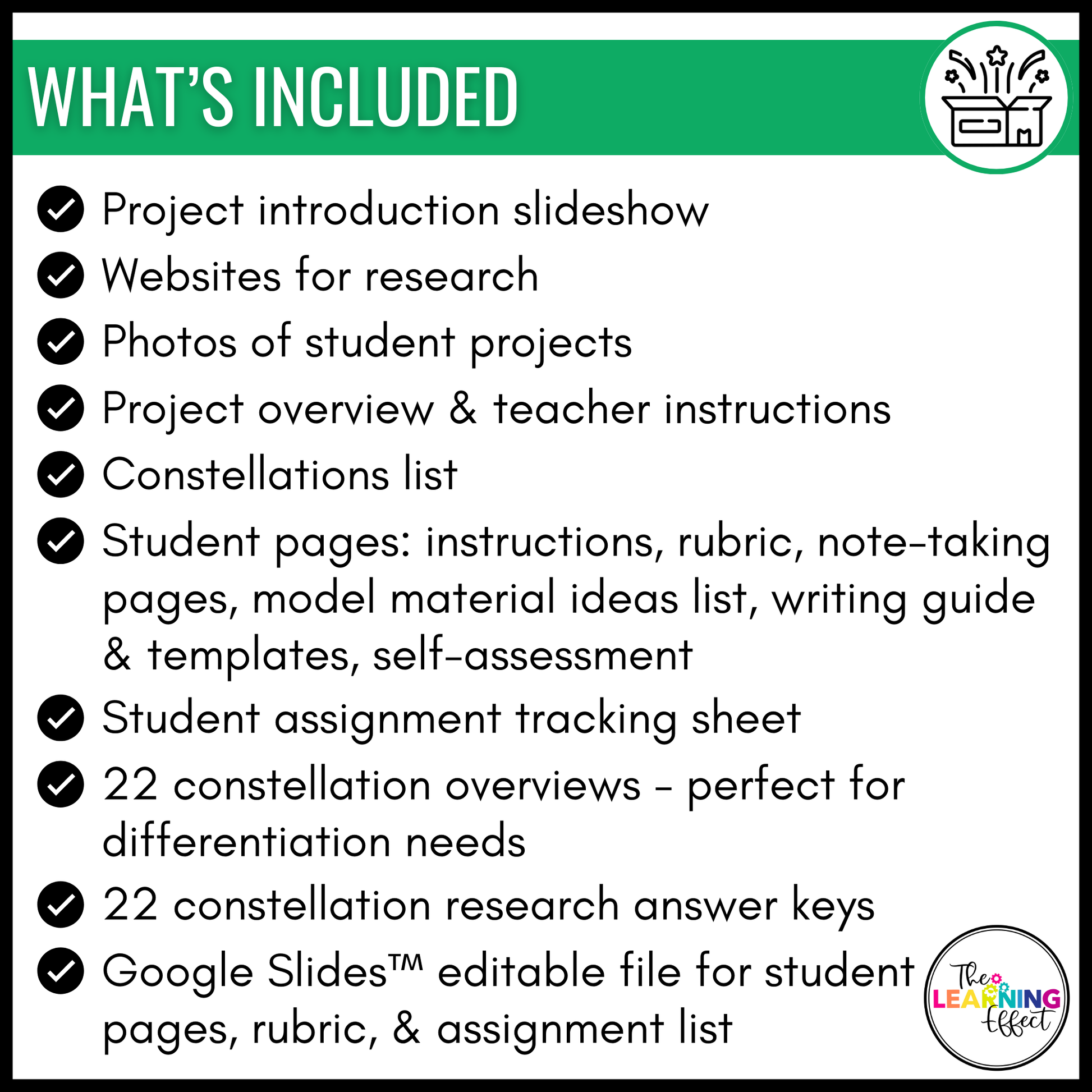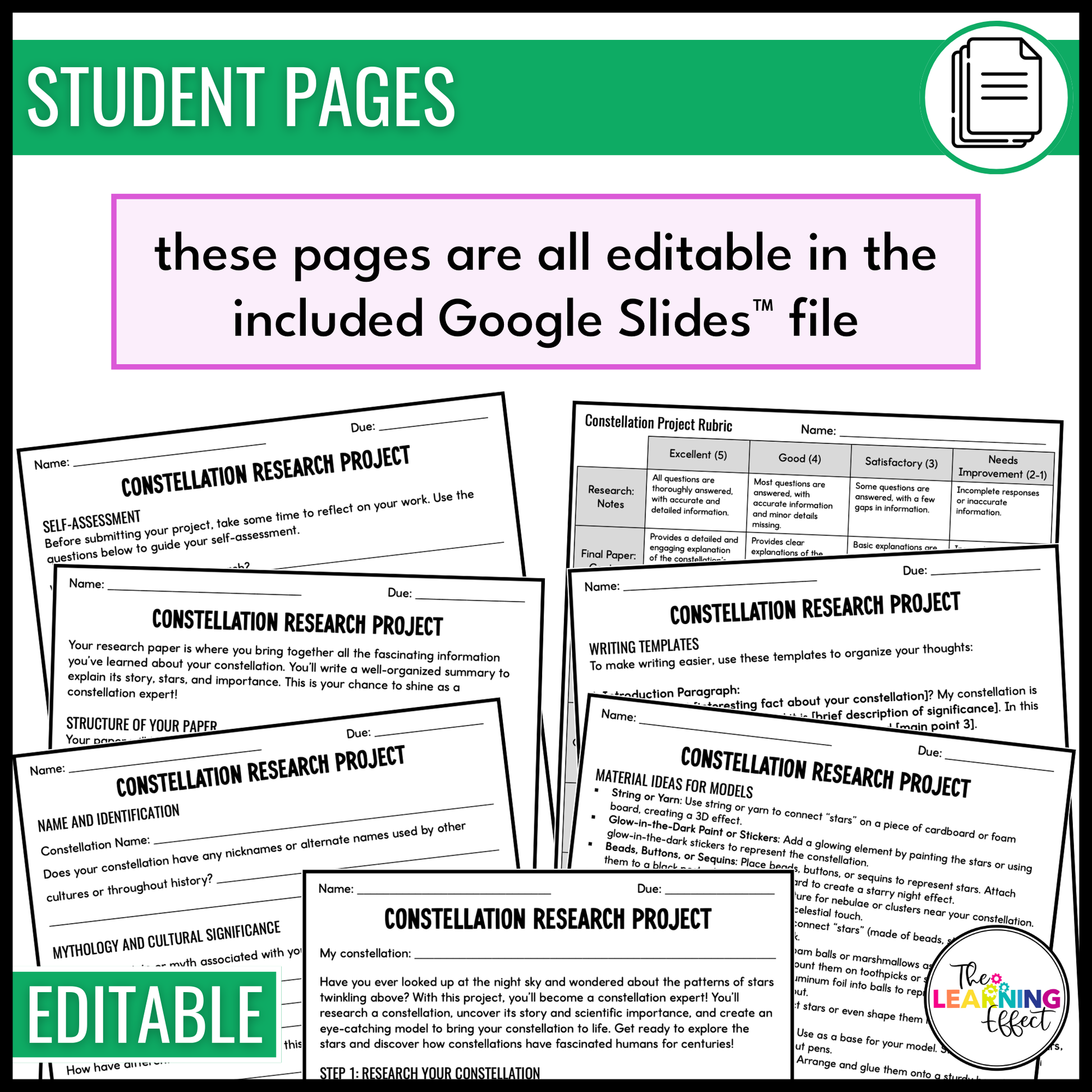 Whether you’re looking for an end-of-unit project or a creative way to reinforce science concepts, the Constellation Research Project is flexible to fit your classroom needs. Use the provided materials as-is or modify the editable pages to match your students’ abilities and goals.