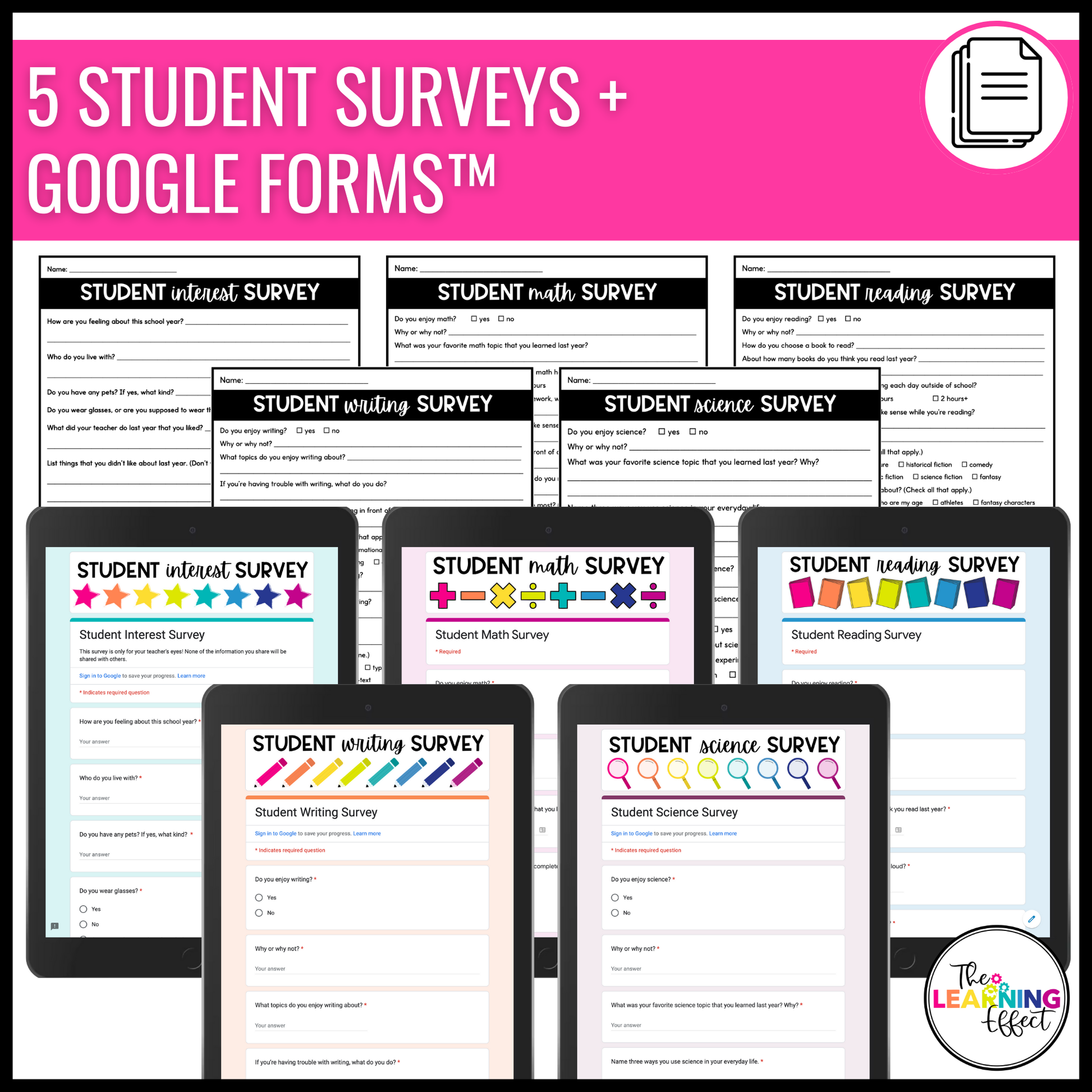 Get to know your students with these surveys and questionnaires. This resource includes surveys for learning more about student interests, math mindset, reading mindset, writing mindset, and science mindset. Print and digital options are included!
