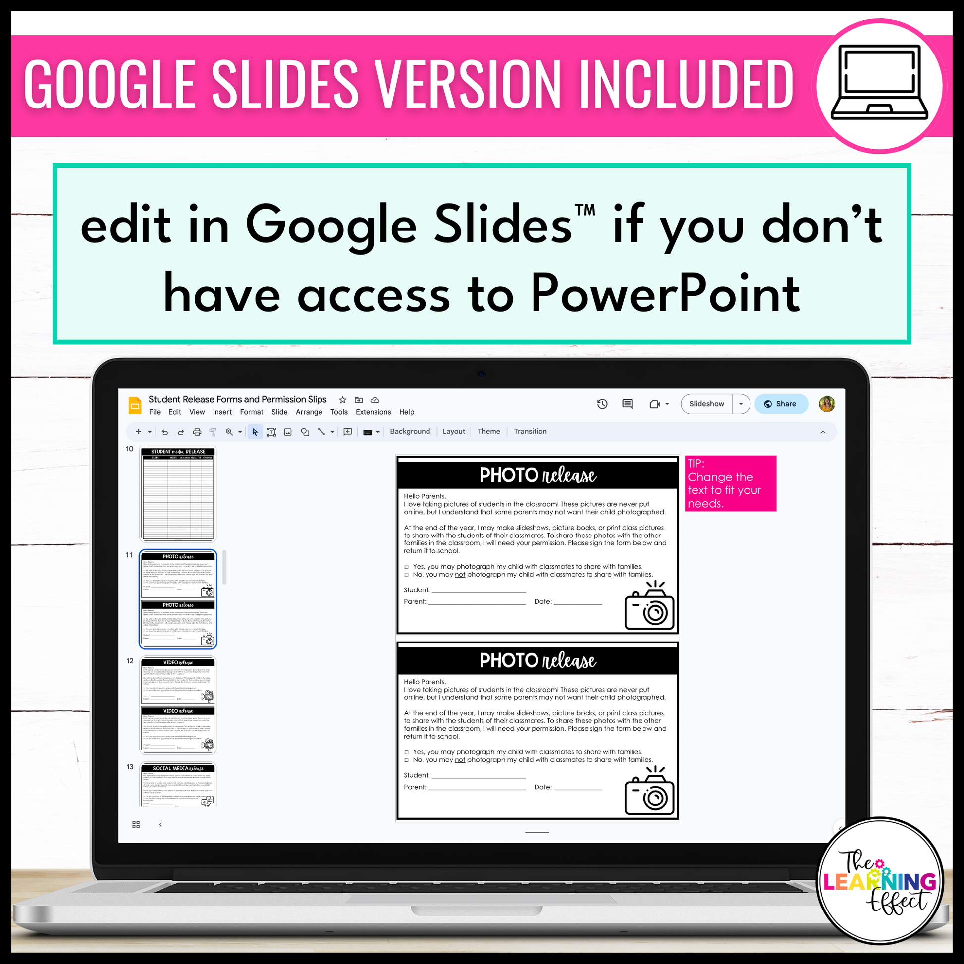 Create student release forms and permission slips with these editable templates. The forms are prefilled with wording that you can customize to fit your needs. Field trip planning sheets are also included in this resource. A PowerPoint and Google Slides file are included so you can create your forms with your preferred software.