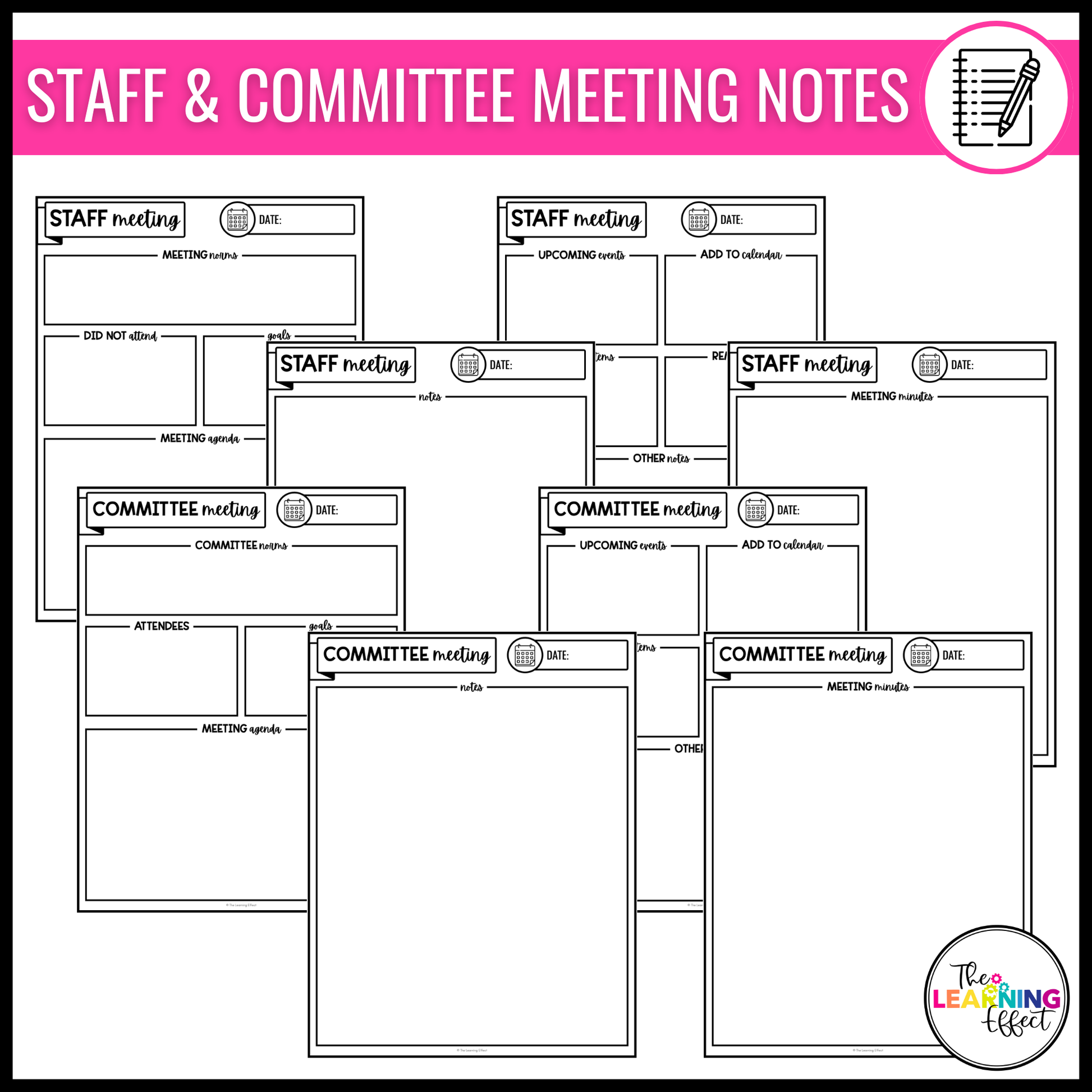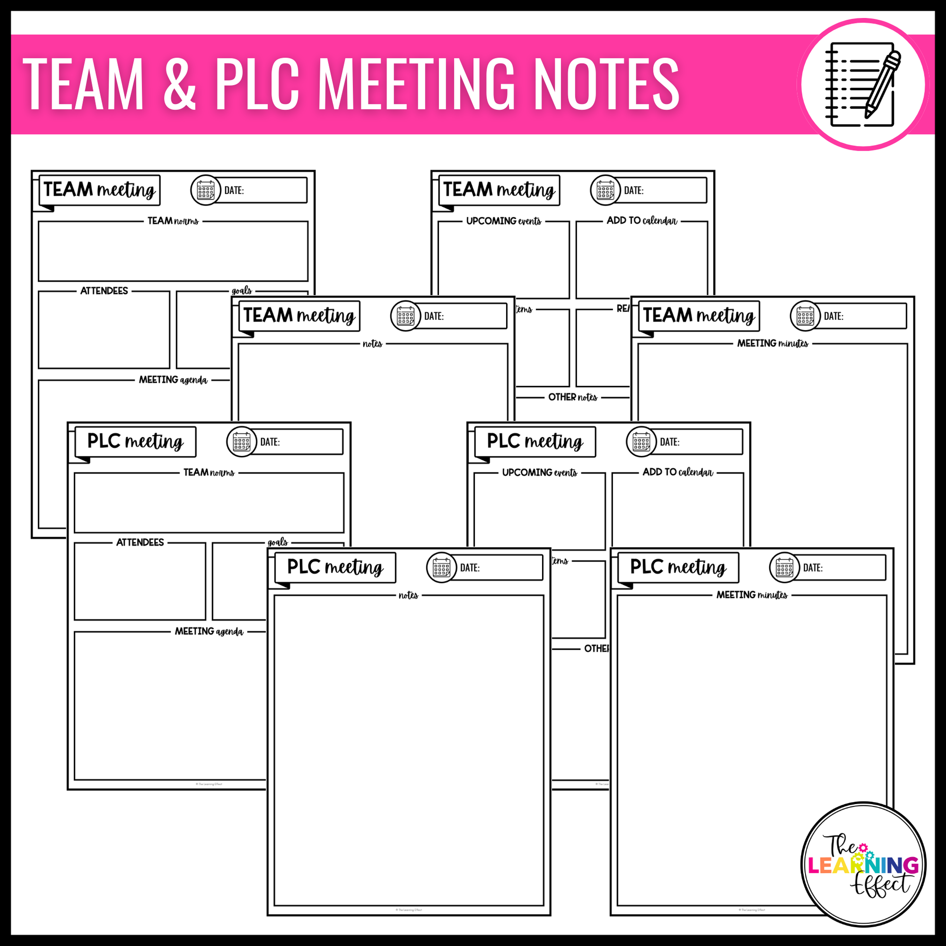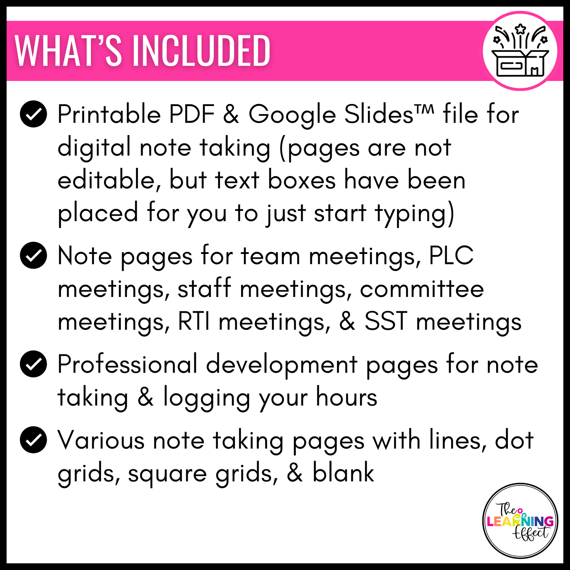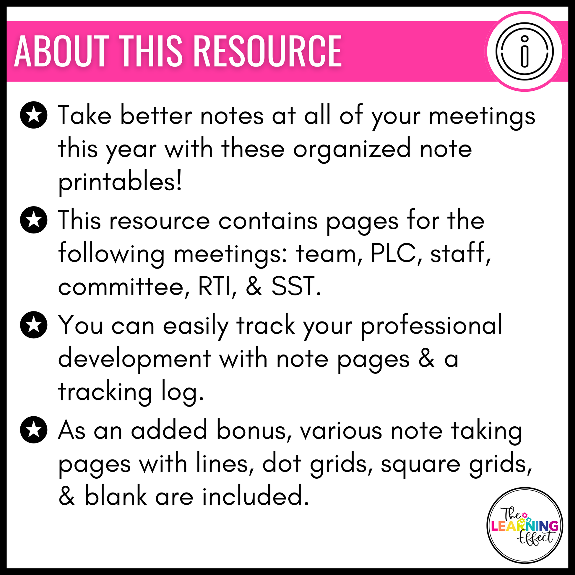 Take better notes at all of your meetings this year with these organized note printables! This resource contains pages for the following meetings: team, PLC, staff, committee, RTI, and SST. You can easily track your professional development with note pages and a tracking log. As an added bonus, various note taking pages with lines, dot grids, square grids, and blank are included.