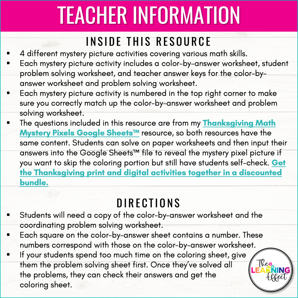 - Each activity has a mystery picture coloring sheet and a math problem worksheet