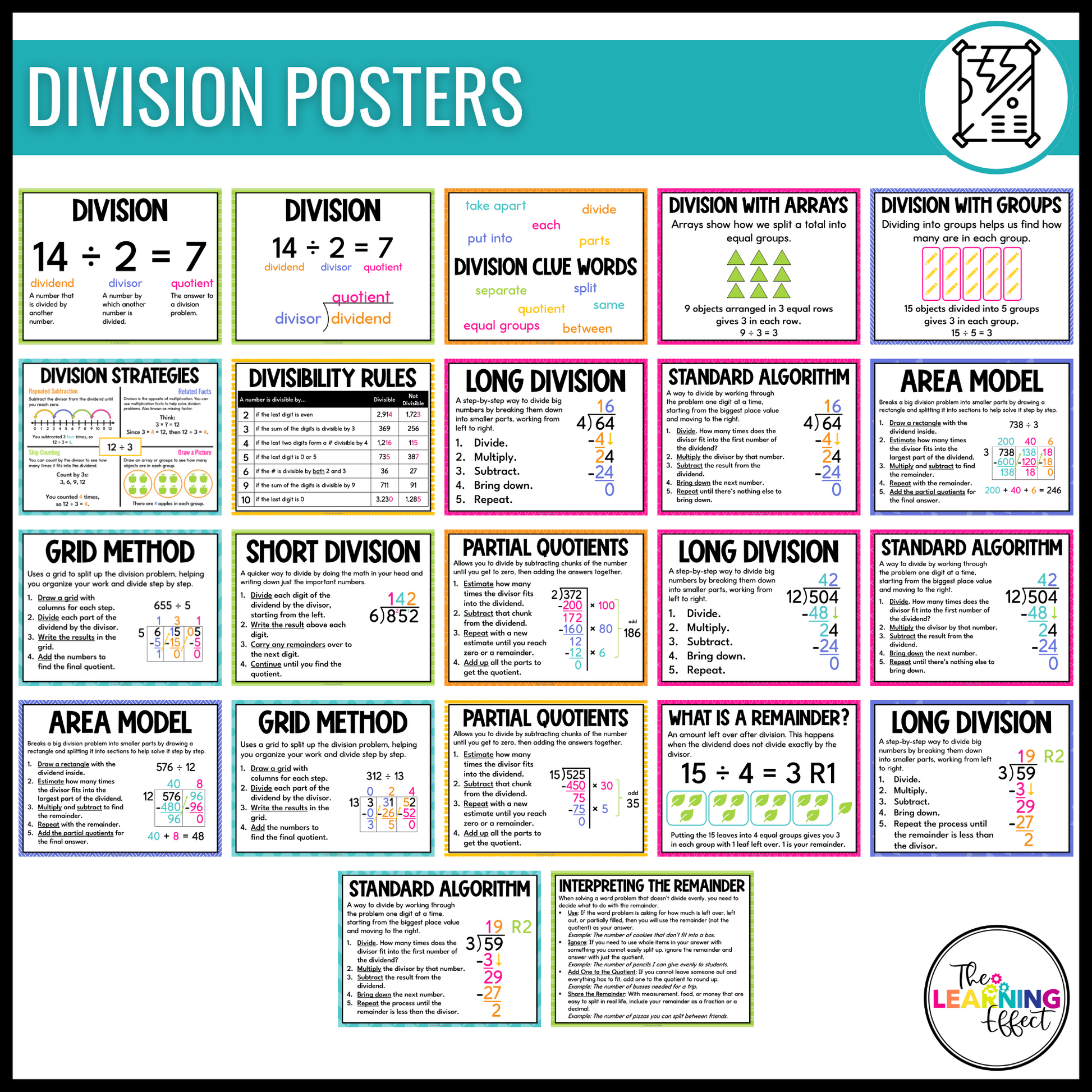 - 22 colorful posters, including: division terms, division clue words, division with arrays, division with groups, division strategies, divisibility rules, long division (one-digit divisors), standard algorithm (one-digit divisors), area model (one-digit divisors), grid method (one-digit divisors), short division (one-digit divisors), partial quotients (one-digit divisors), long division (two-digit divisors), standard algorithm (two-digit divisors), area model (two-digit divisors), grid method (two-digit divisors), partial quotients (two-digit divisors), what is a remainder?, long division (with remainders), standard algorithm (with remainders), interpreting the remainder