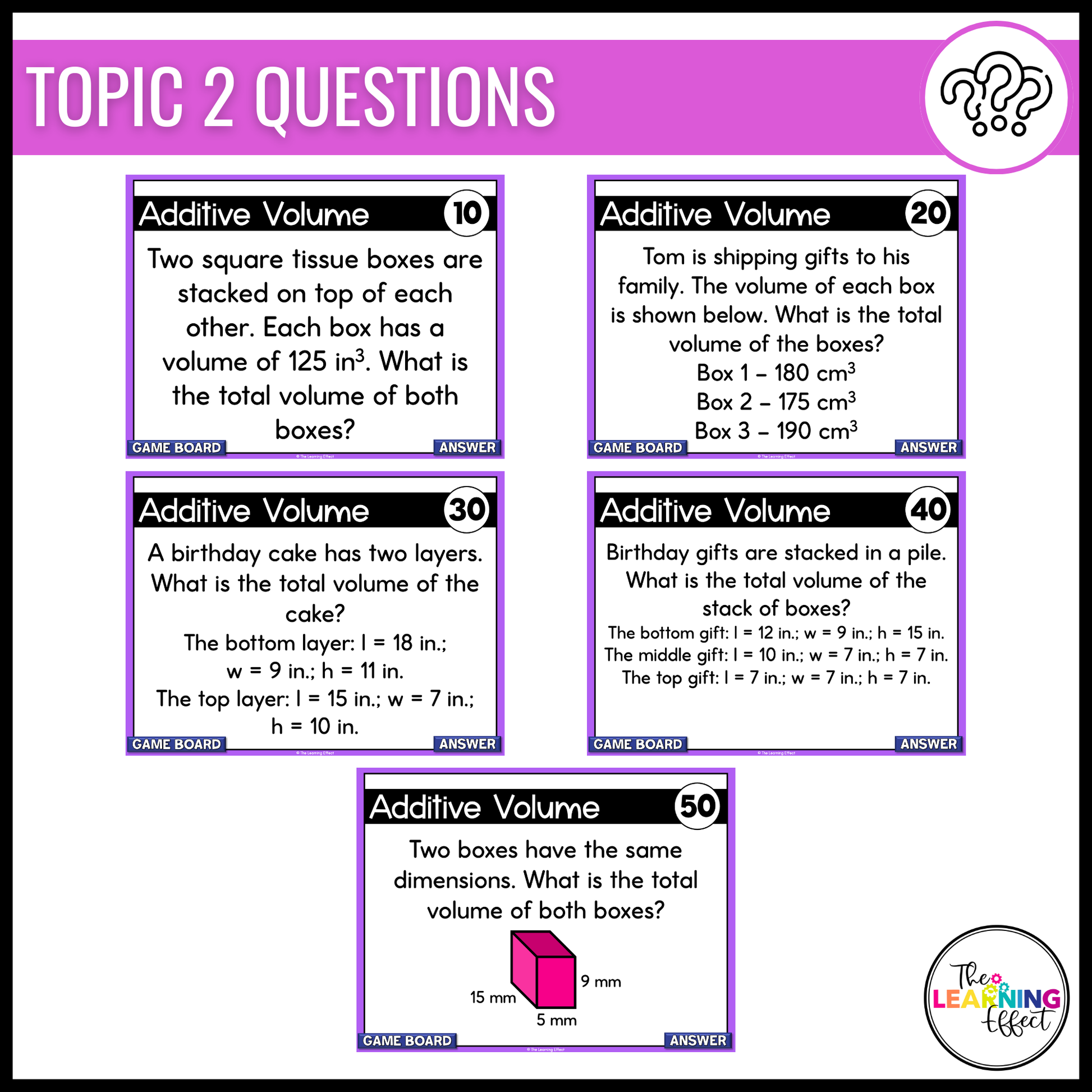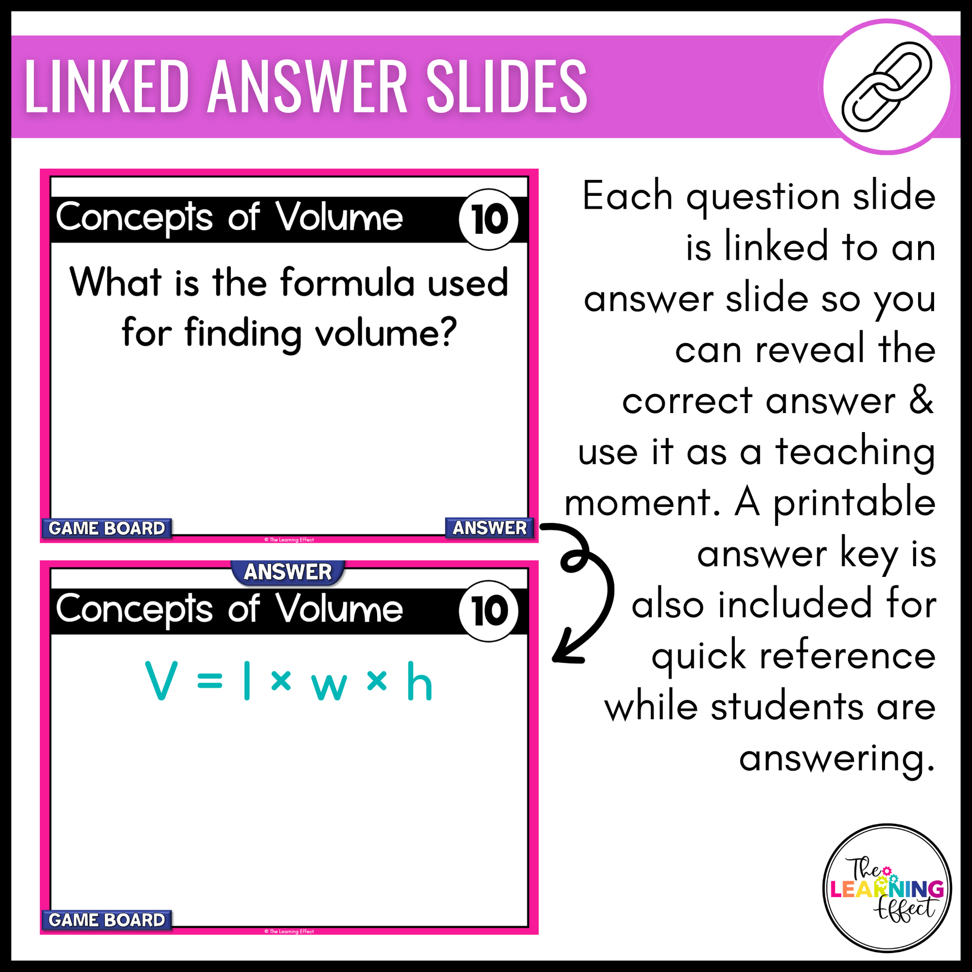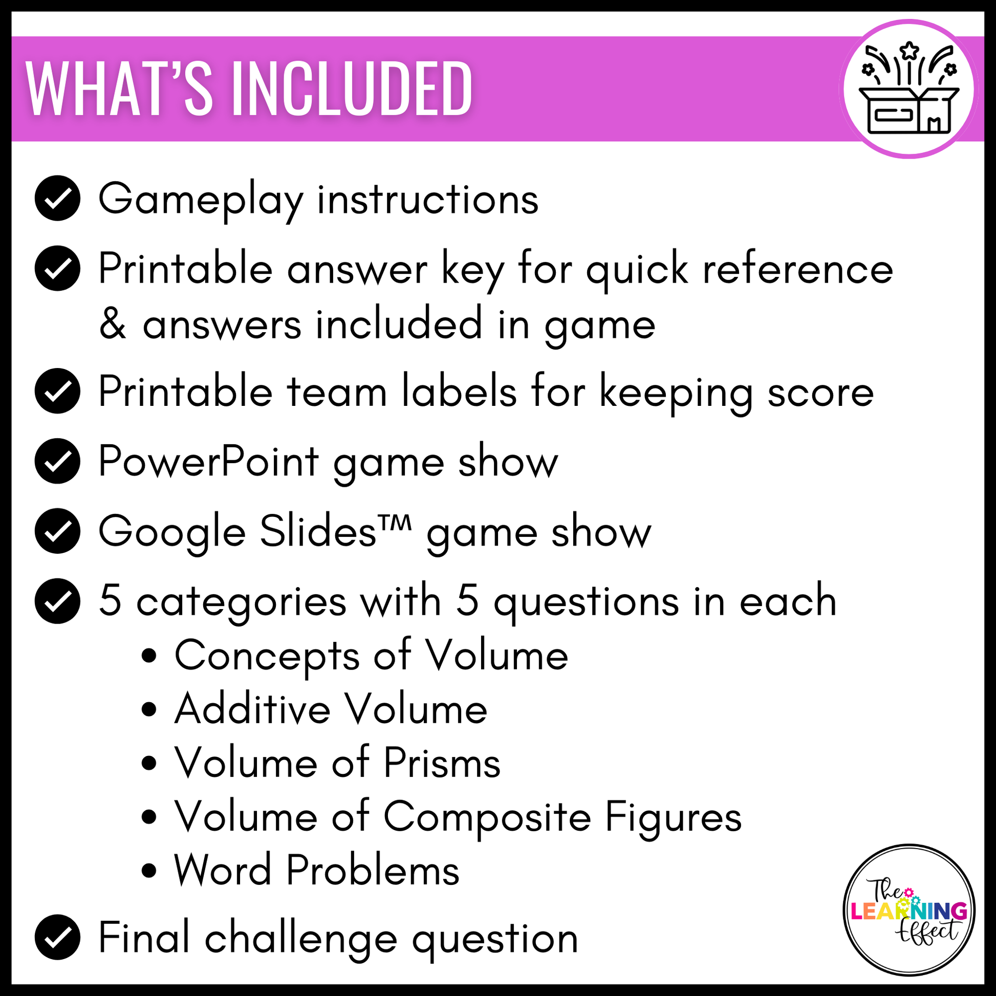 Review Volume in a fun and interactive way that involves your whole class. This engaging game show plays like Jeopardy® and covers 5th grade math skills, including concepts of volume, additive volume, volume of prisms, volume of composite figures, and word problems. Perfect for end of year or end of unit review.